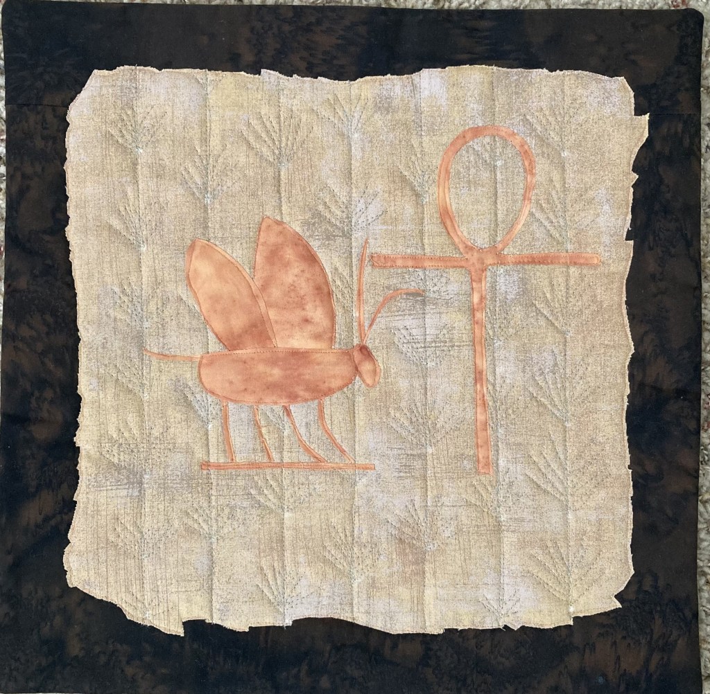 For our 2026 theme of Time, I have chosen communication. This first block shows two images I photographed at Al Karnak, a temple in Luxor, Egypt. The rought-cut edges are a reference to the papyrus substrate, Materials used were batiks, hand-dyed fabric and a commercial cotton. It was machine quilted with a stylized papyrus pattern.