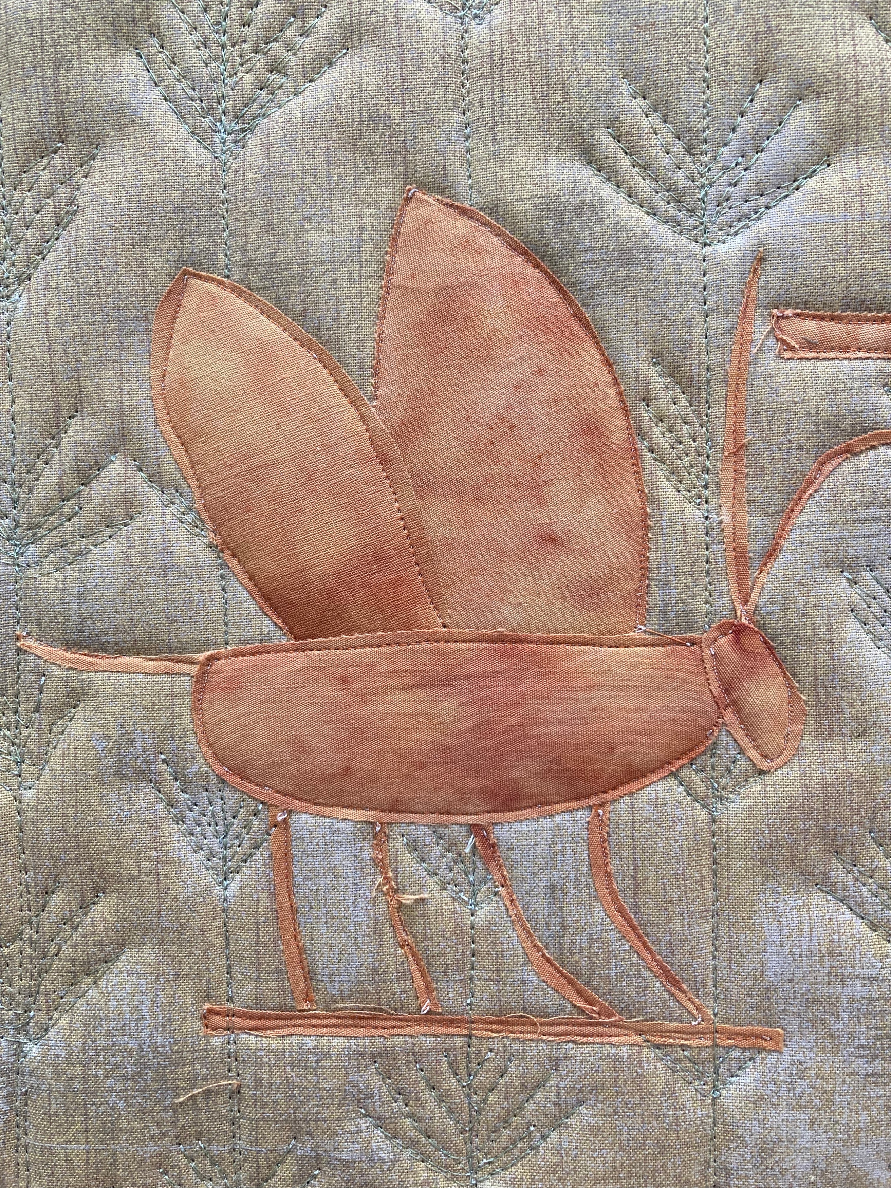 For our 2026 theme of Time, I have chosen communication. This first block shows two images I photographed at Al Karnak, a temple in Luxor, Egypt. The rought-cut edges are a reference to the papyrus substrate, Materials used were batiks, hand-dyed fabric and a commercial cotton. It was machine quilted with a stylized papyrus pattern.