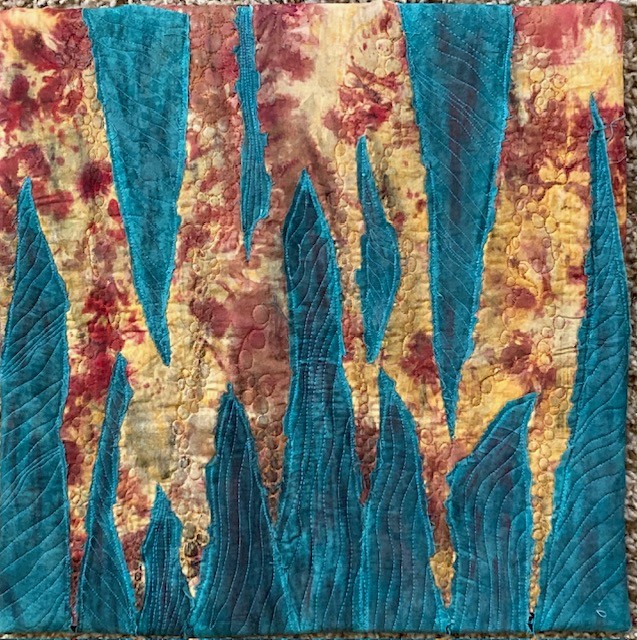 Continuing with a Rust theme, I’ve chosen to do a detailed view of a well-rusted object. Enhancing the turquoise paint with charcoal and colored pencil has given it an old and dirty appearance. The quilt motifs are meant to add dimension. I’ve used commercial cottons, hand dyes. Charcoal and colored pencil. It is machine quilted.