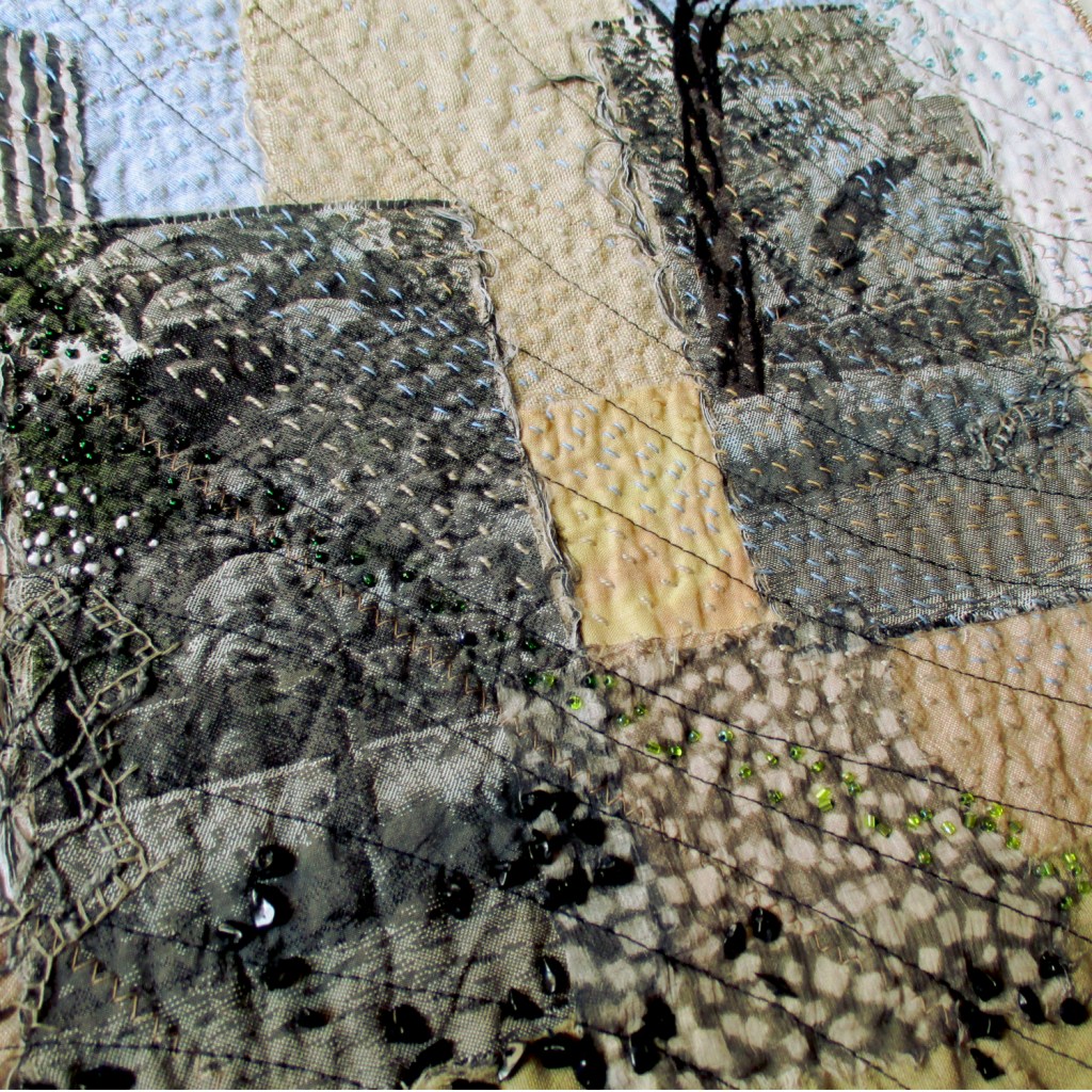 The texture you’ve created with your choice of fabrics, layering of fabrics, hand stitching and beadwork is amazing! Well done.