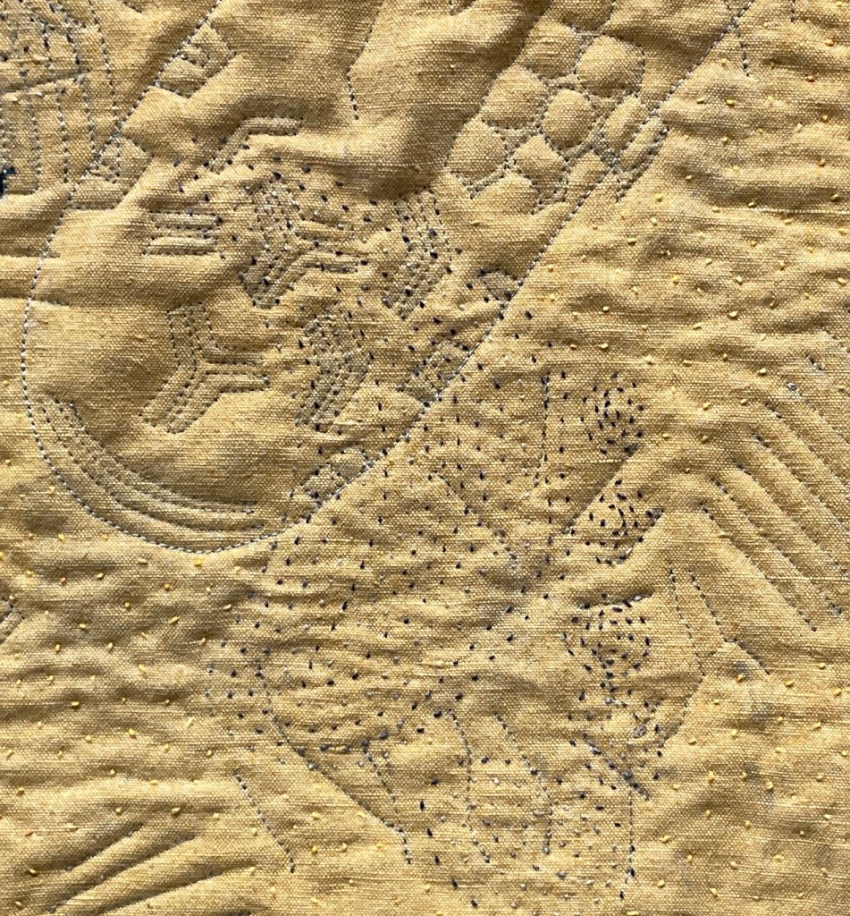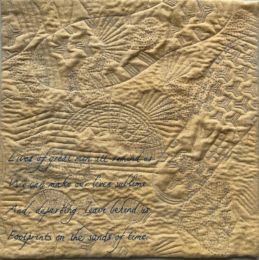This piece is an abstract depiction; on old linen sheeting I printed random items I found on the beach and boot prints in blue pigment and then overpainted with yellow natural earth pigment. The verse of the poem was added with ink and then I over-stitched by machine and finally hand stitched bare footprints to accentuate the footsteps and give texture to the untouched sand.