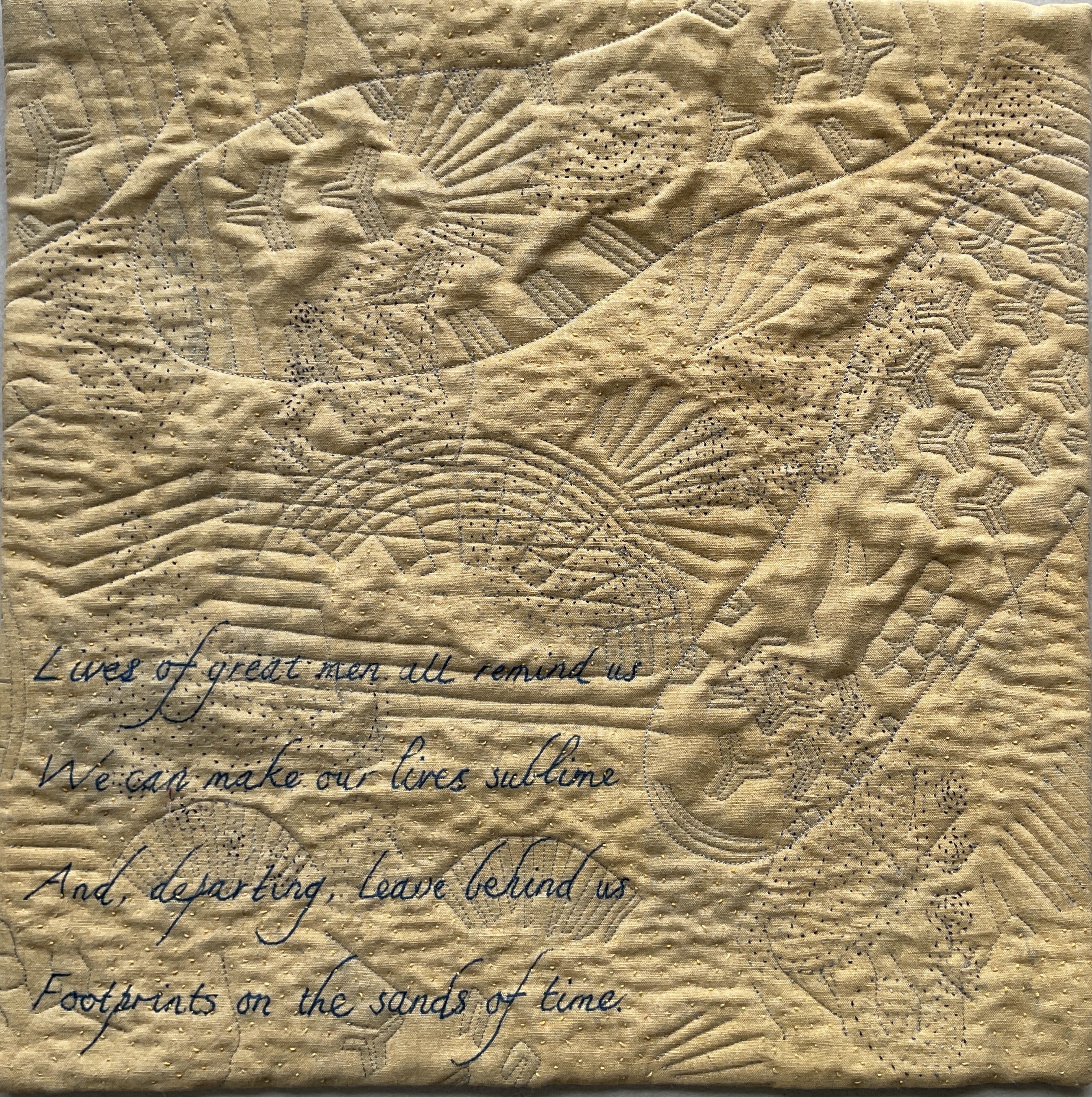 This piece is an abstract depiction; on old linen sheeting I printed random items I found on the beach and boot prints in blue pigment and then overpainted with yellow natural earth pigment. The verse of the poem was added with ink and then I over-stitched by machine and finally hand stitched bare footprints to accentuate the footsteps and give texture to the untouched sand.