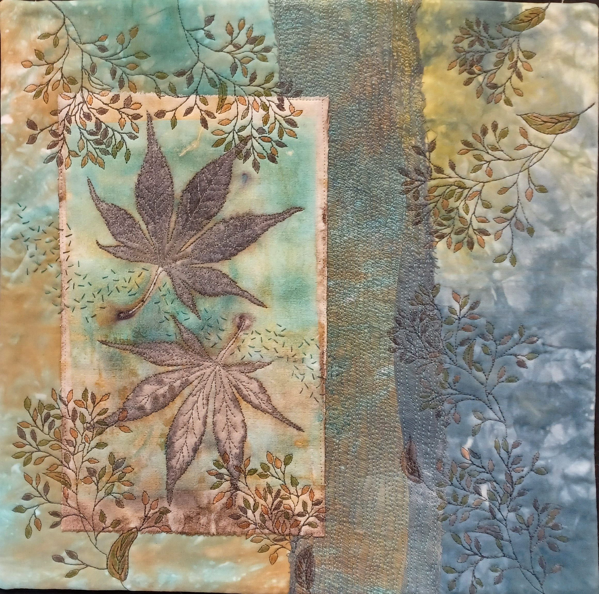 Eco-print on linen, self-dyed cotton and buttercloth, inktense pencils, free-motion-quilting, hand embroidery.