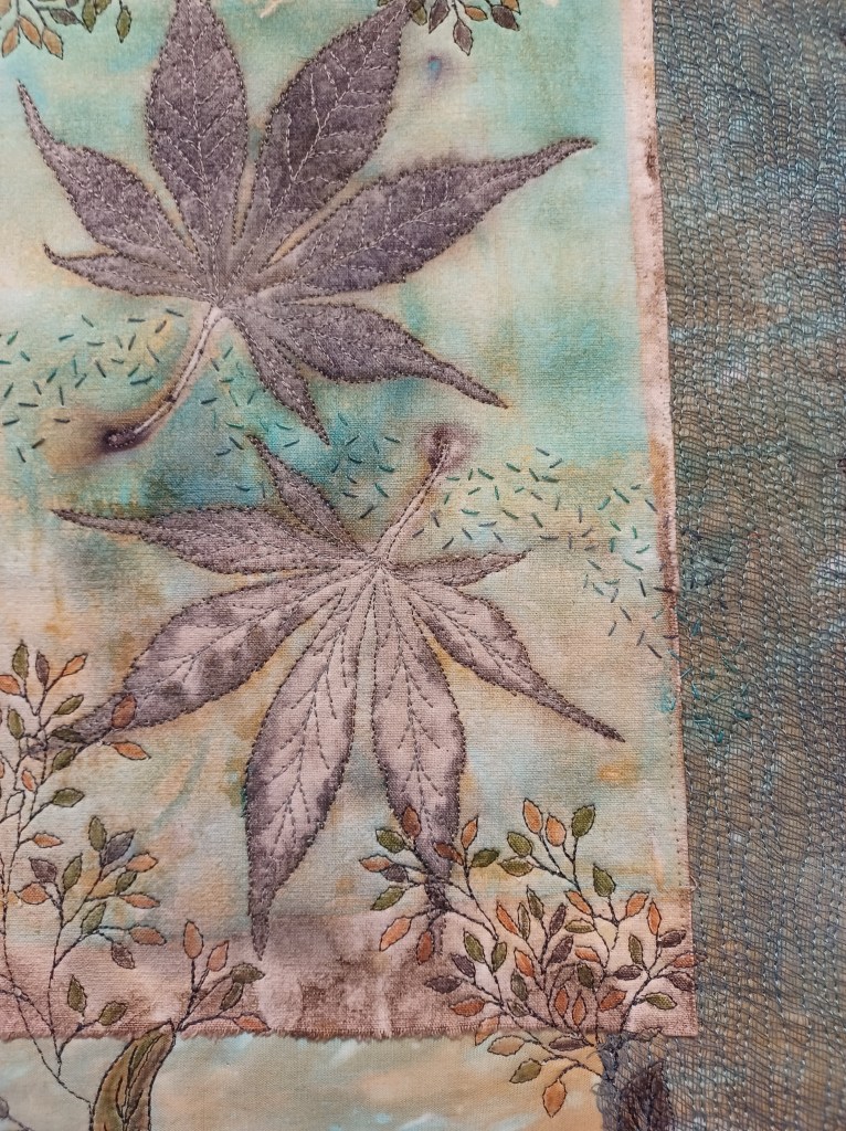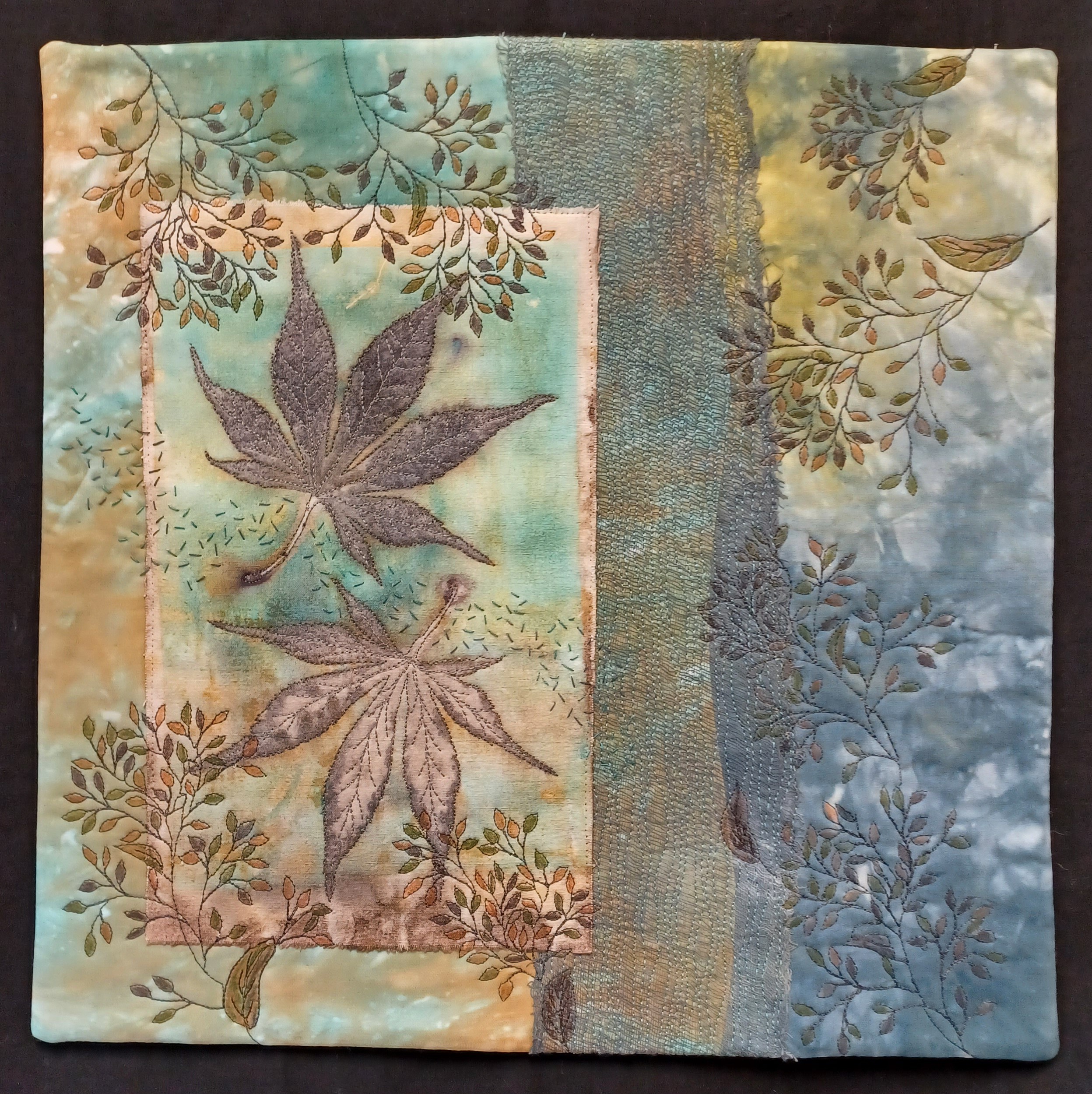 9. I love how you used the eco printed fabric. Great machine stitching of the leaves.