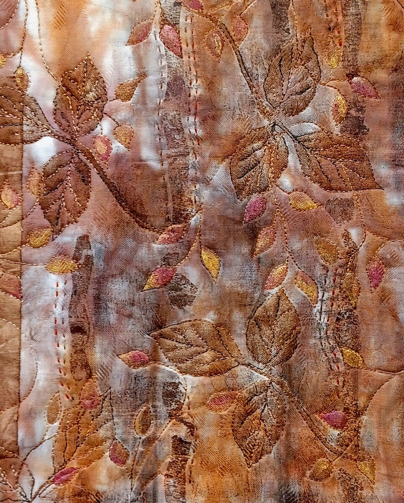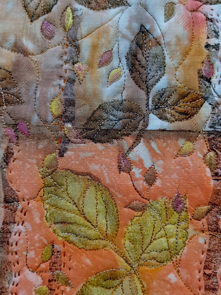 Ecoprint on cotton, dammassé cotton fabric, fabric painting, rubbing with inktense blocks, painted vliesofix applications, free motion quilting and machine embellishment.