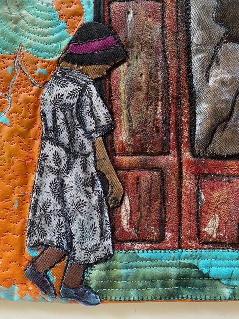 The door is stitched, painted and finally burned with a soldering iron. The broken  glass is silver fabric with a double layer of tulle over it.  A small window is added with tyvek shutters and an old piece of cloth (decay) hanging 3D out of the window.