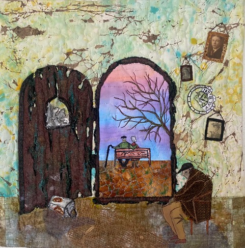 Old couple outside on a somehow damaged bench and a very old man inside on a small stool.  All appliqued.