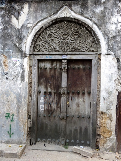 The front doors of many buildings are individual works of art, but carry deeper meaning, measures of the original occupant’s social satus and religion. Some of them are warped, others splintered and cracked, covered in graffity. Many of the buildings are in a state of disrepair with crumbling discolored walls and fallen plaster. The door that I photographed appealed to me because of its beautiful frieze above the door frame featuring carvings of twisting vines and flowers. This design is thought to be Swahili.