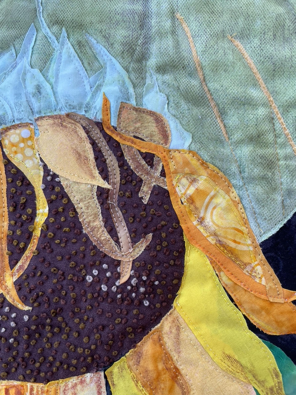 I like the idea showing the evolution of decay of the sunflower. Your choice of fabric colors and stitching depicts the decay very realistically. Nicely done.