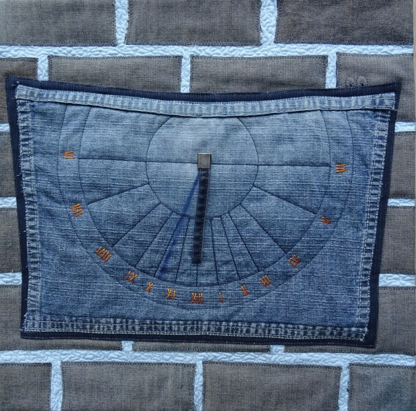 Stones have been applied to the light blue background to form a wall. The sundial is part of the back of a denim jacket. The needle is the end of a denim cord. The numbers are embroidered with orange pearl cotton.