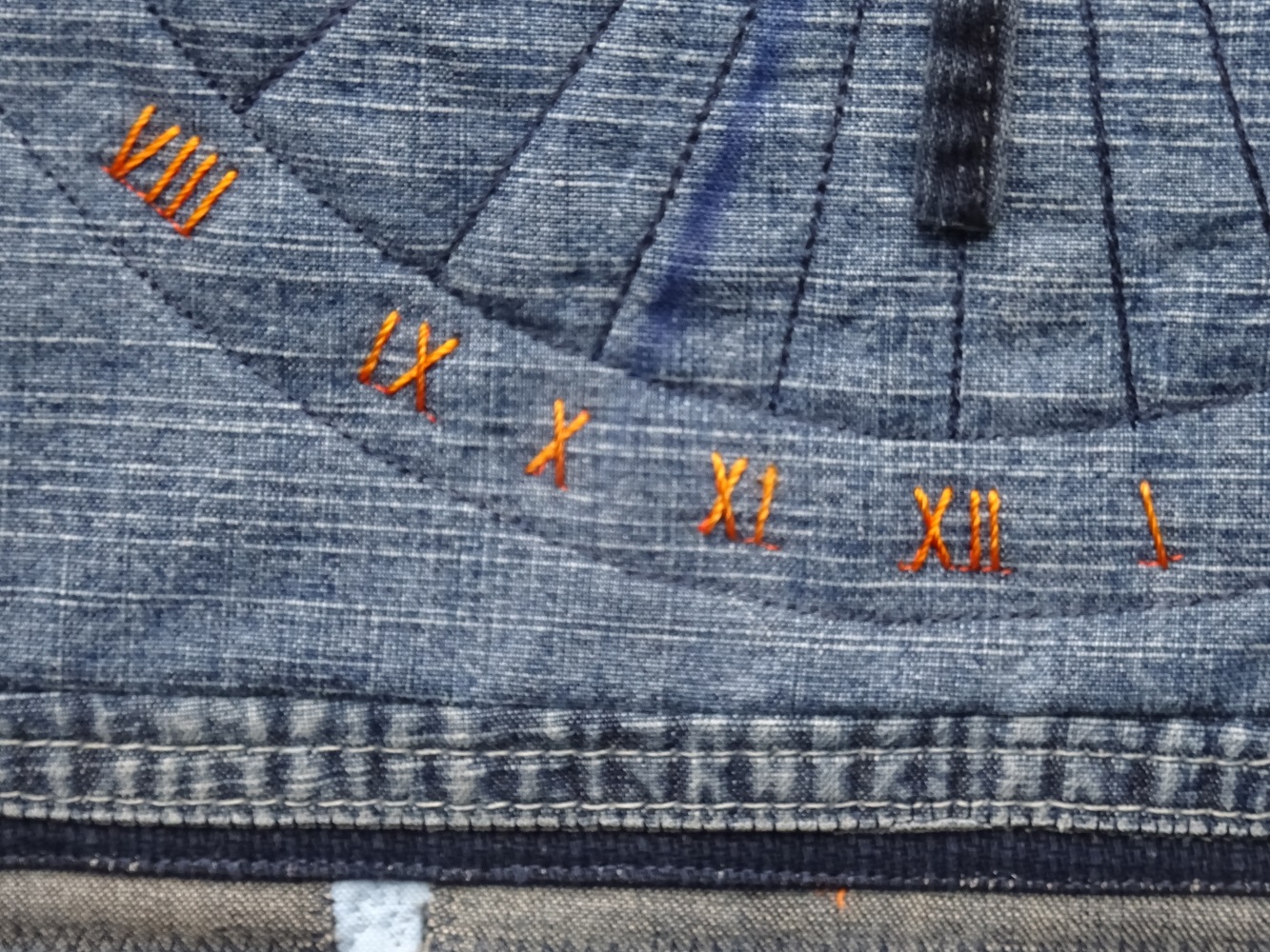 Stones have been applied to the light blue background to form a wall. The sundial is part of the back of a denim jacket. The needle is the end of a denim cord. The numbers are embroidered with orange pearl cotton.