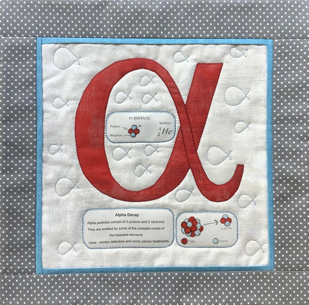 For the second half of the Decay challenge I have again looked to my science background. This time I’ve chosen the world of Physics. The 3 remaining quilts will illustrate the 3 types of radioactive atomic decay – alpha, beta and gamma. This first quilt of the 3 focuses on alpha decay, the least energetic and so the least damaging of the 3 types. Certain large, unstable atomic nuclei emit alpha particles as a way of becoming stable. Each alpha particle consists of 2 protons and 2 neutrons and is emitted from its parent nucleus together with a small amount of energy. There is a lot more science involved in the properties and uses of this type of decay but I’ve left it basic.