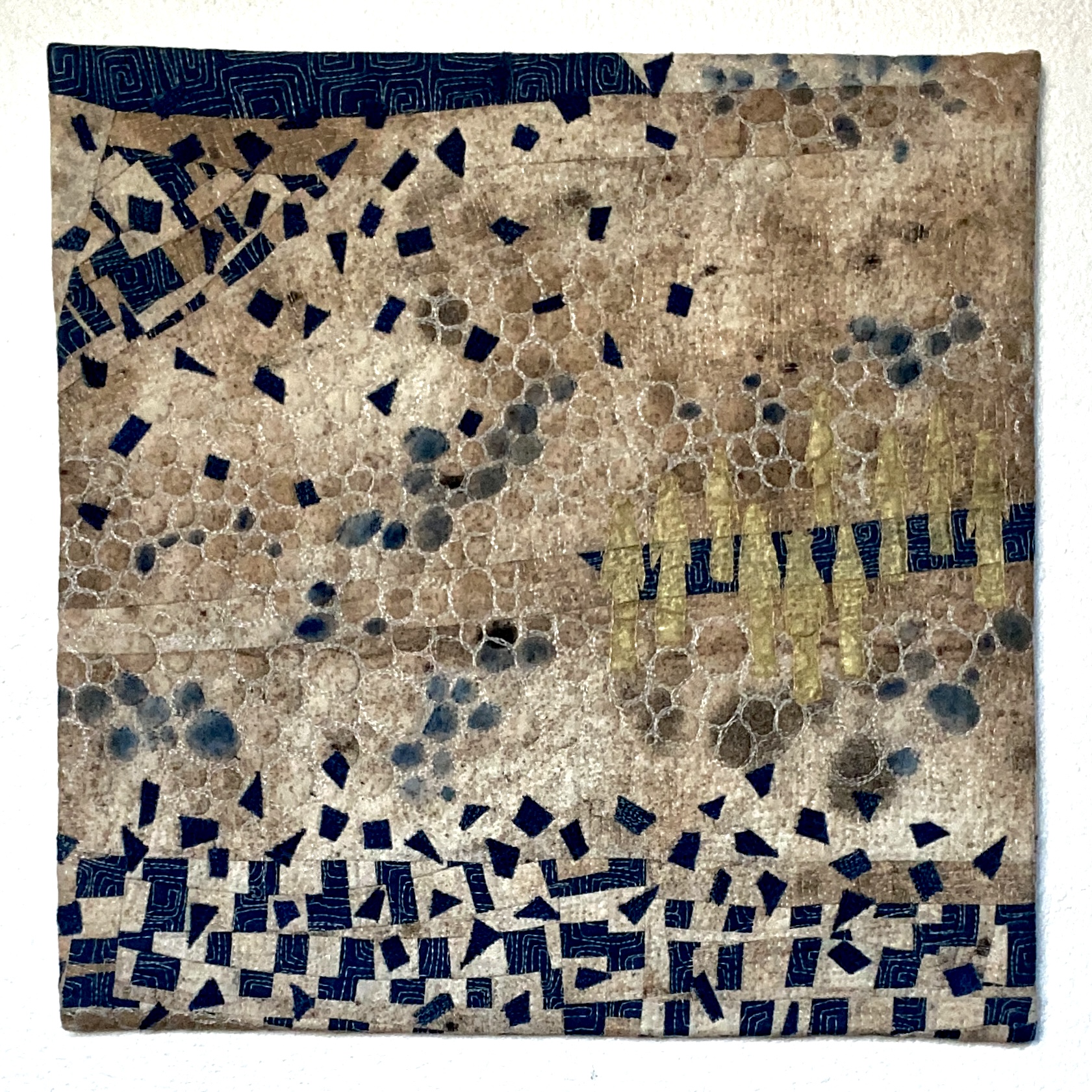 A very interesting way to deal with the subject. Beautiful choice of fabrics and colour palette. I find the interpretation fascinating. The stitching greatly enhances the piece. Well done!