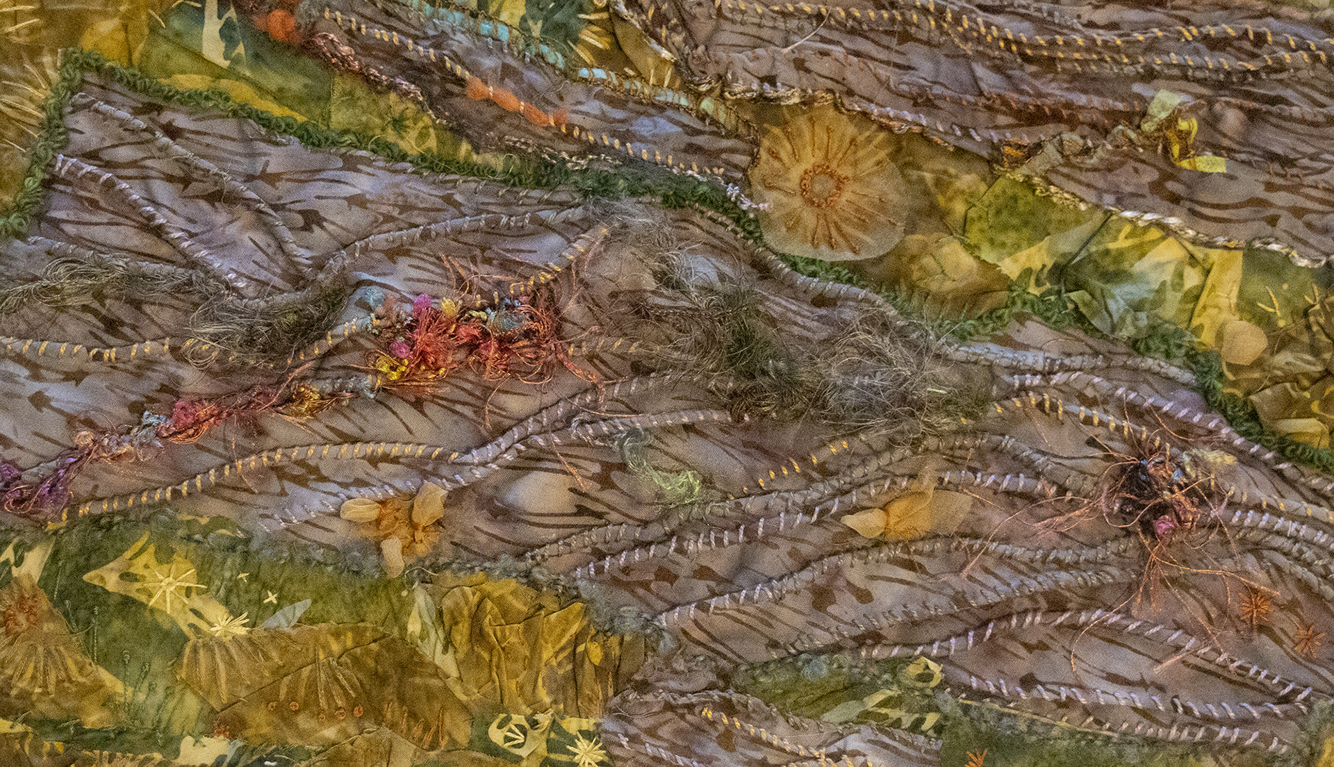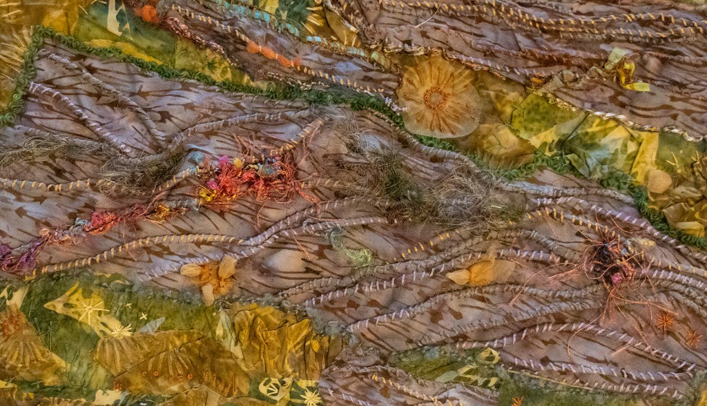 The way that you have created the fabric gives it real texture and the stitching enhances that texture. The colours are great and I can see the forest floor in the design. Well done