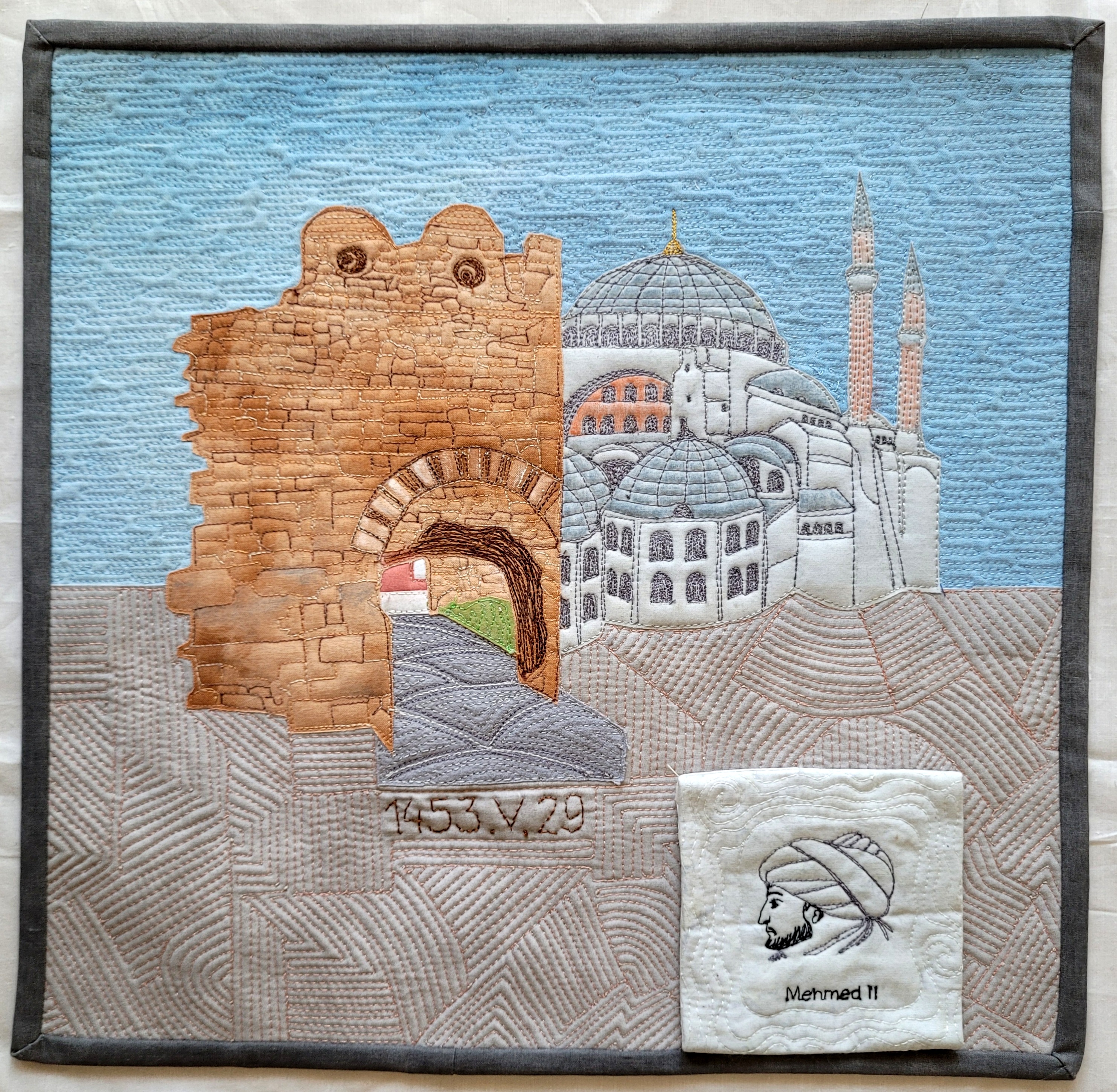 I visited Constantinople (Istanbul) last year (2025). I stayed in downtown and had to enter to it through the gate in the old wall of Constantinople the photo of which I used in my quilt. From the threshold of my hotel, I could see domes and minarets of Hagia Sophia.