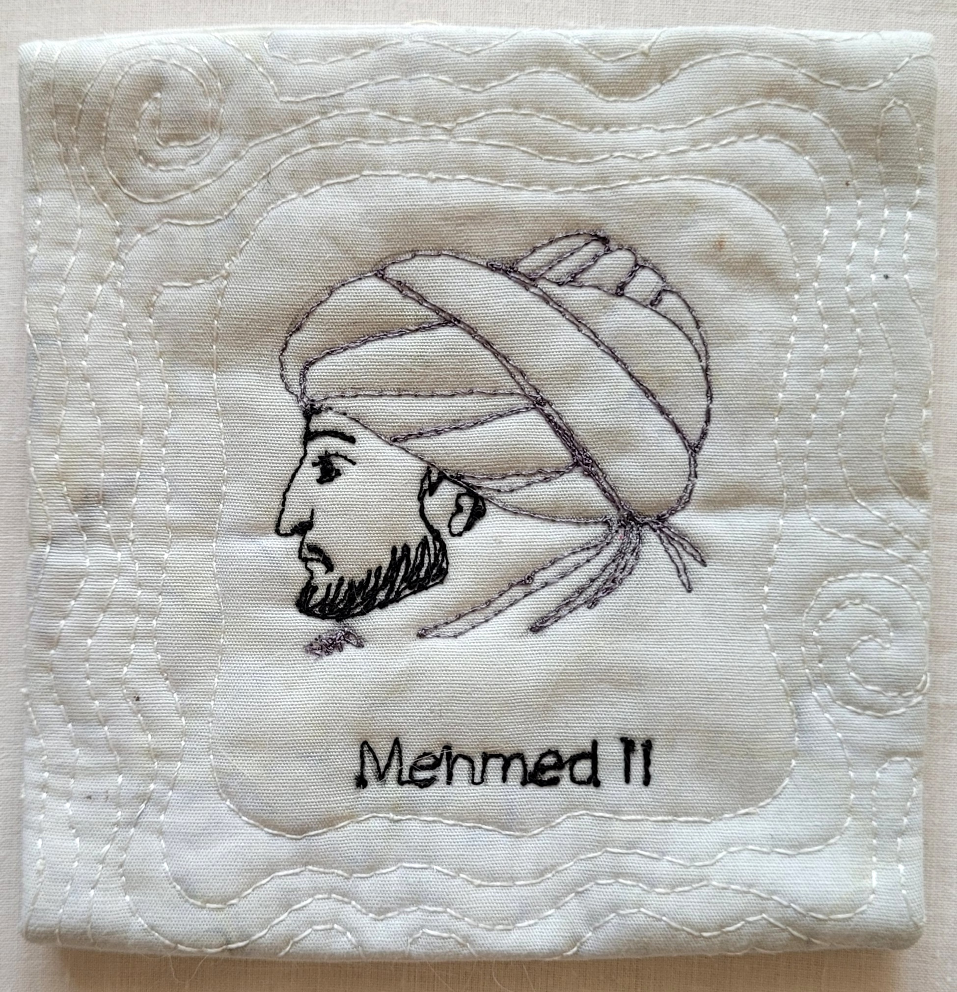The portrait of the Sultan Mehmed II was machine embroidered. It measures 4×4 inches.