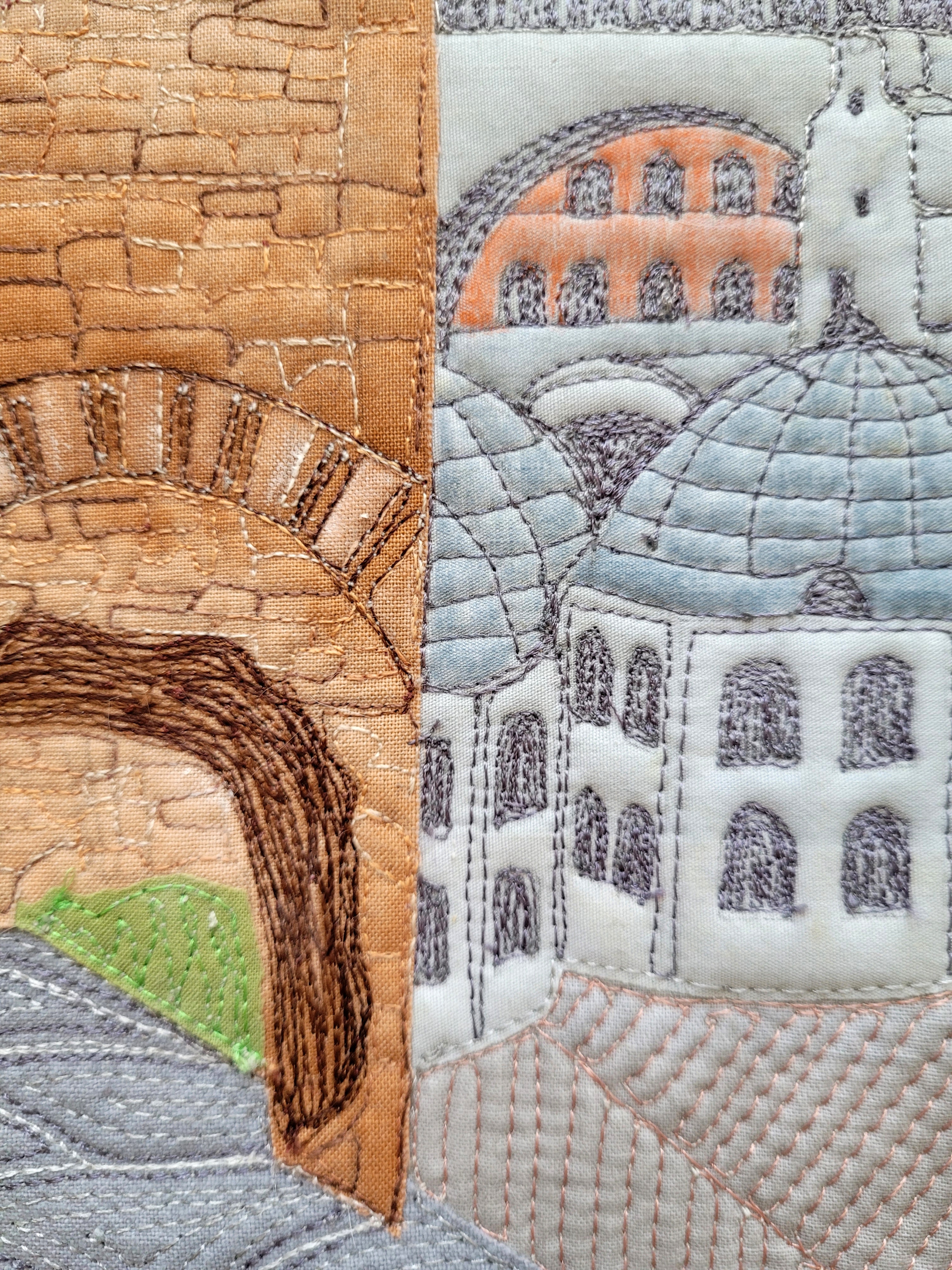 I used Canva to make sketches of the parts of my photos and printed them on fabrics, ironed on sheets of freezer paper. Then I machine embroidered them and used Inktense pencils to color the domes and walls of Hagia Sophia. The background is machine quilted.