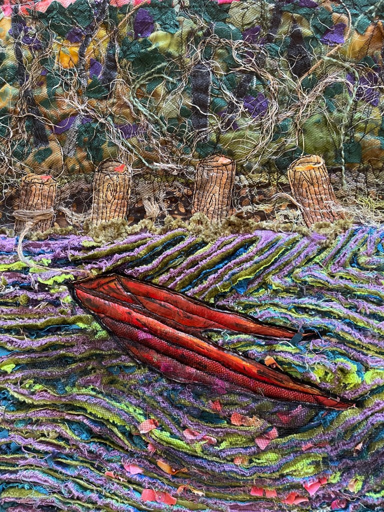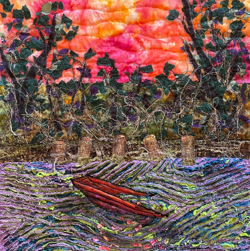 You have created so much drama in this piece! The outstanding colors, the reflection of the stunning sunset in the waters. Very daring to use the chenille technique for the water, it is so effective! That boat so lifelike! Awesome all of it!