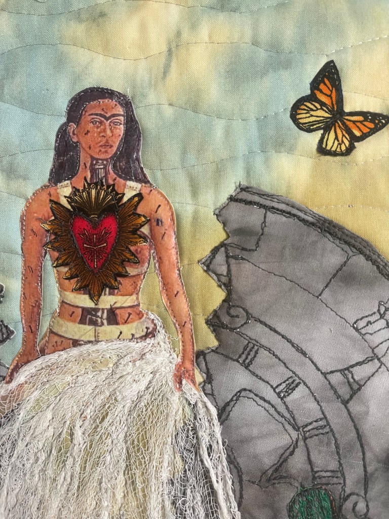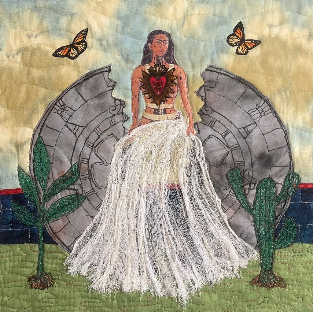 In this art quilt series I will explore the passage of time using the 25 ton Aztec sun calendar and Frida Kahlo’s life journey. Each quilt will represent a different time or stage of her journey, and the enduring legacy of her art.