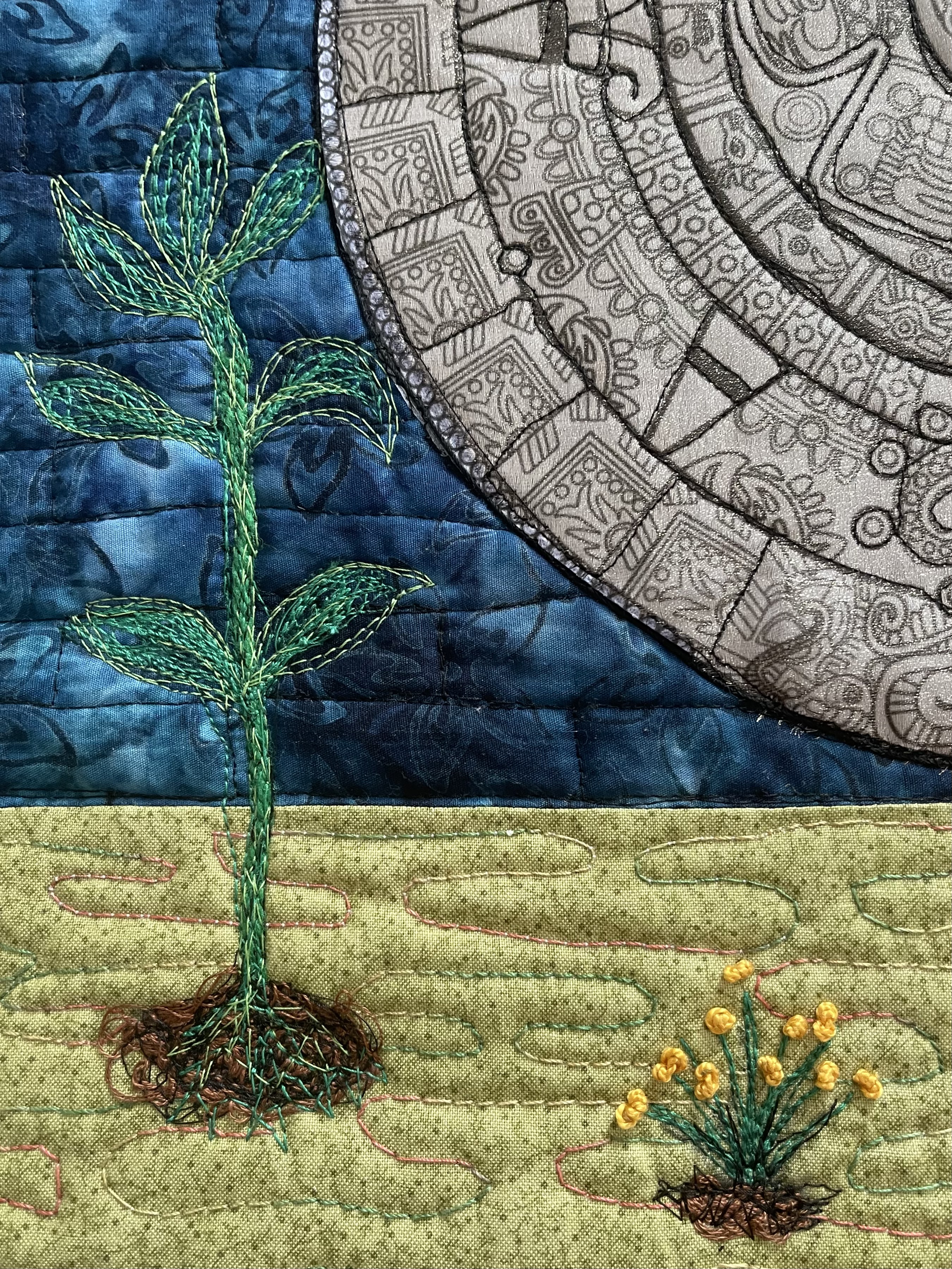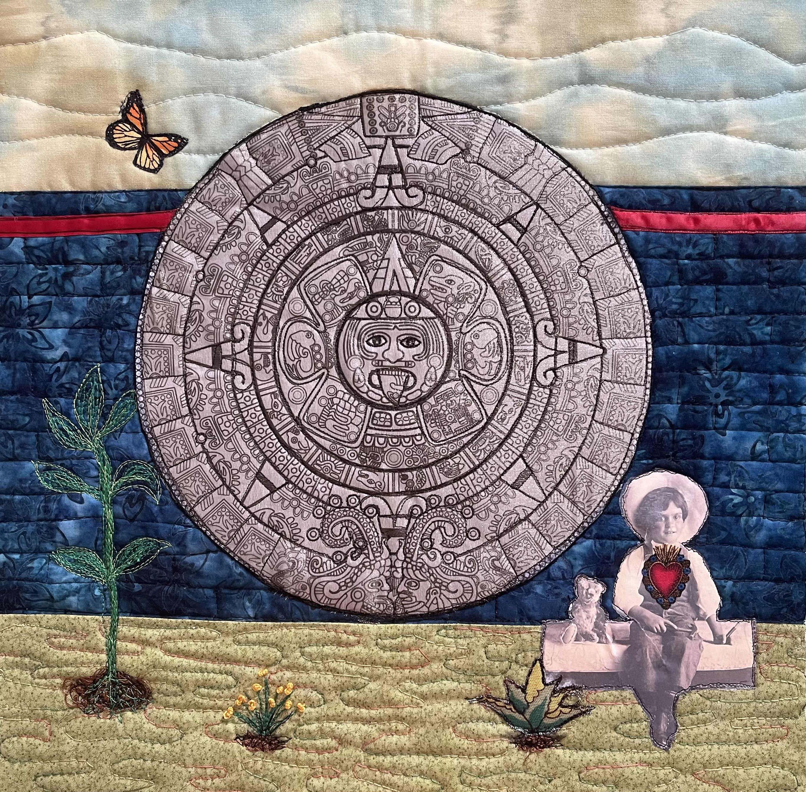 In this new art quilt series I will explore the passage of time using the 25 ton Aztec sun calendar and Frida Kahlo’s life journey. Each quilt will represent a different time or stage of her journey, and the enduring legacy of her art.