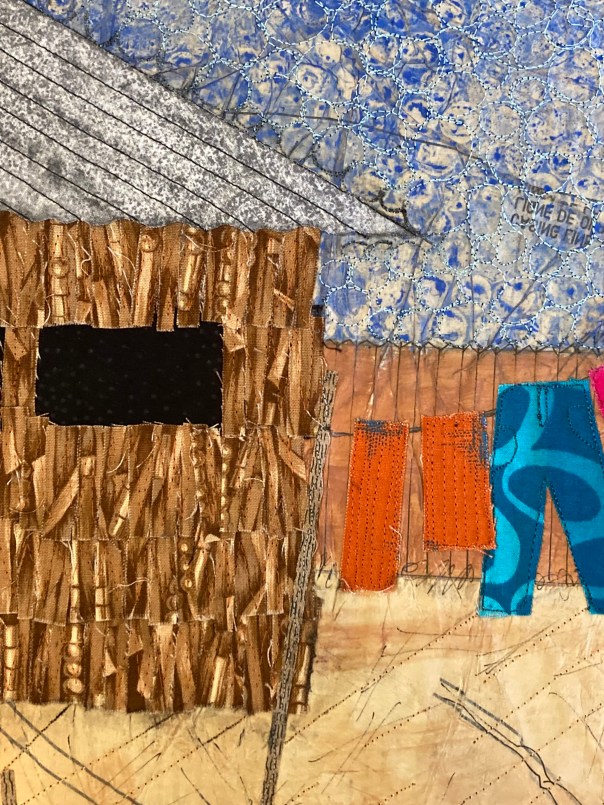 MATERIALS: background is paper fused to muslin, then painted and stitched. The houses are constructed from narrow strips fused to Wonder Under, then stitched in place. Details for the fence, clothesline and garden are created with a Pigma Micron pen. Close up view: