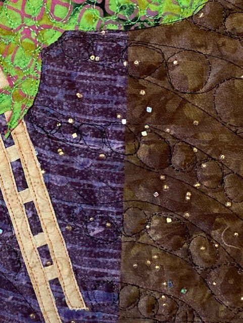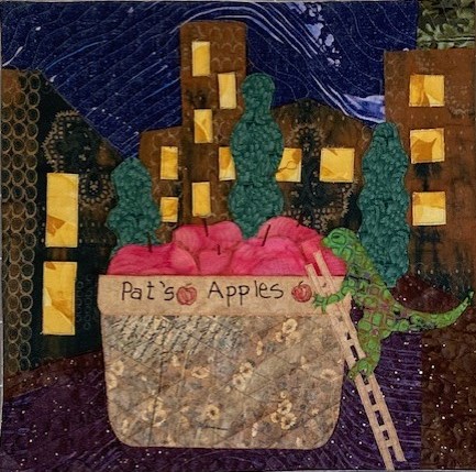 Pat and Bill are two minor characters introduced in chapter 4 of “Alice’s Adventures in Wonderland”. Pat the Gardener is asked by the Rabbit to rescue Alice from the too-small room. He proclaims that he is busy digging for apples but agrees to help free Alice. He summons Bill the lizard to fetch a ladder so as to enter the room through the chimney. As Bill drops down into the room, Alice sharply kicks him up and out of the chimney. (Alice eventually swallows more cake, shrinks back to normal size, and exits the room on her own.) My quilt is constructed from batiks, hand dyes, commercial cottons, chiffon, tulle, and muslin-backed paper. It is embellished with ink and colored pencil and is machine quilted.