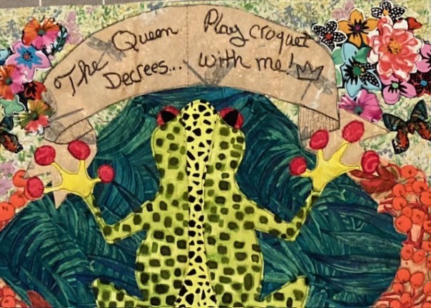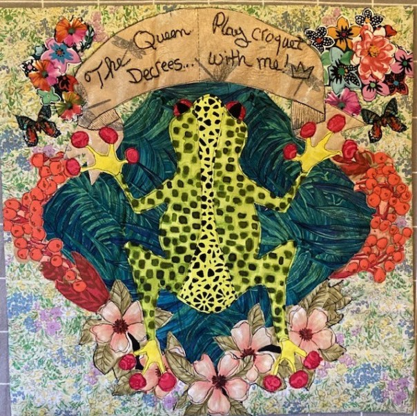 Still working on portaying minor characters from Alice’s Adventures in Wonderland, this is The Frog Footman. The Queen has extended an invitation to th Duchess to play croquet. Book #3 shows the Queen’s Fish Footman presenting the invitation to… the Frog Footman, this months’ quilt. The Frog Footman has recieved the invitation and has opened it to deliver it to the Duchess. I’ve used the broderie perse technique to place the frog in a garden full of flowers. Once again I’ve made a gel medium skin as I did with book#3 and attached it to tissue paper to create the banner. Materials used were commercial cottons and batiks, tissue paper and gel medium.