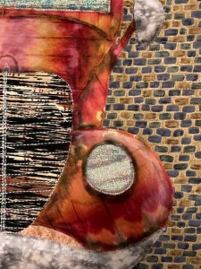 This is the second vehicle quilt I have made, the first being sometime last year. I’m drawn to the lines and texture in vintage cars and trucks, particularly if they are rusty and dented. While this tow truck is a Ford from the 1930’s, I created the hood ornament to suit my needs by encircling the letter “a”. This series I’m working on is all about the front grilles and I am working on several more, enough to present to a local gallery for a possible exhibition. (The folks in my town love classic cars.)