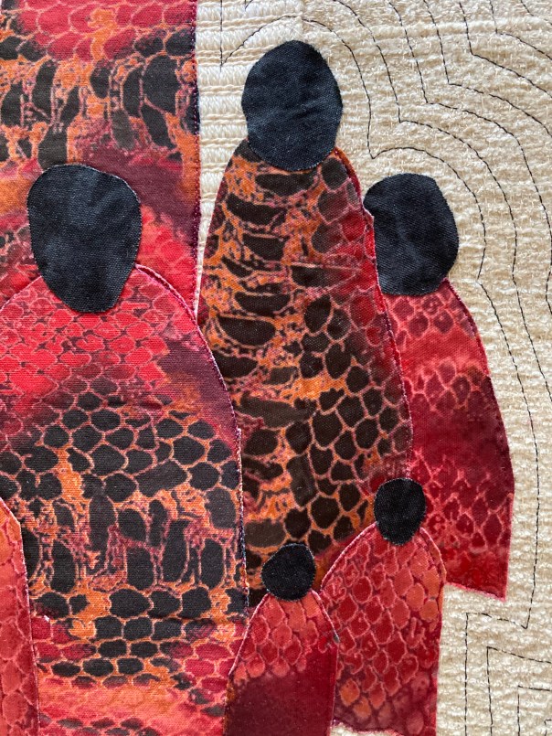 Inspired by a line from Emma Lazarus’ poem inscribed at the Statue of Liberty, “give me your tired, your poor, your huddled masses yearning to breathe free…”, I visualized the many so desperately desiring to leave their homelands and set foot upon these shores. Nameless and faceless, they want only to better themselves and their lives, or escape unimaginable situations. Materials used were decorator fabrics, Lycra, commercial cotton, felt.