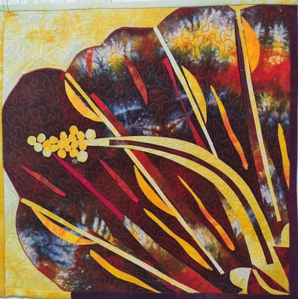 9. Very nice view of the innards of the flower. A tough challenge indeed, but you keep surprising us with different views every time. Great stitching and the fabrics work very well.