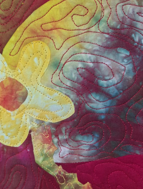 The lovely little flower stands out beautifully against the abstract and vibrant background. The color placement adds lovely highlights and shadows while the stitching creates depth and texture. Well done!