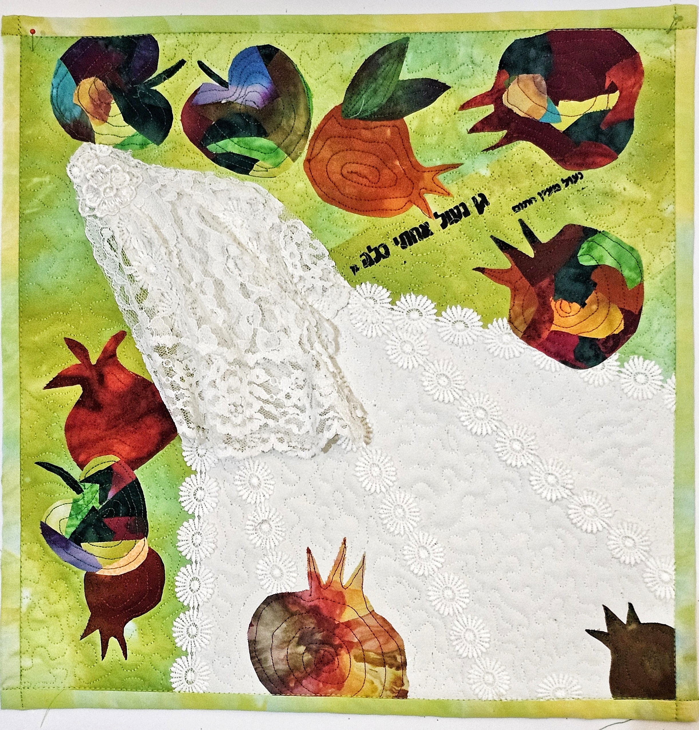 Lovely representation of the bridal veil to depict the words from the quotation. The pomegranate fruits add a contrast in the composition, and the stitching is beautiful. Well done