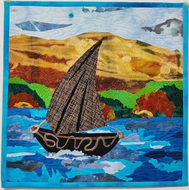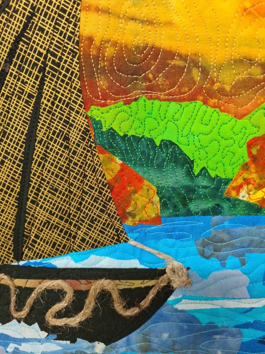 What strikes me in this piece is the light ! your technique for fusing fabric is very effective especially with the water, it seems that the boat is moving …