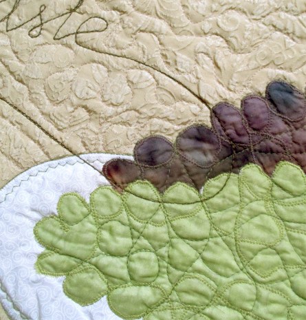 The piece is done entirely by machine, in limited neutral palette and intense quilting making all the different textures.