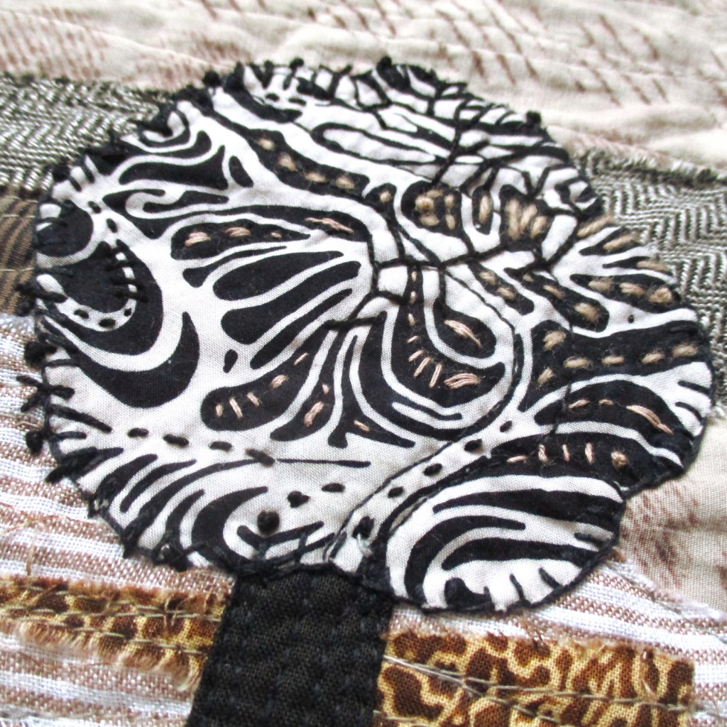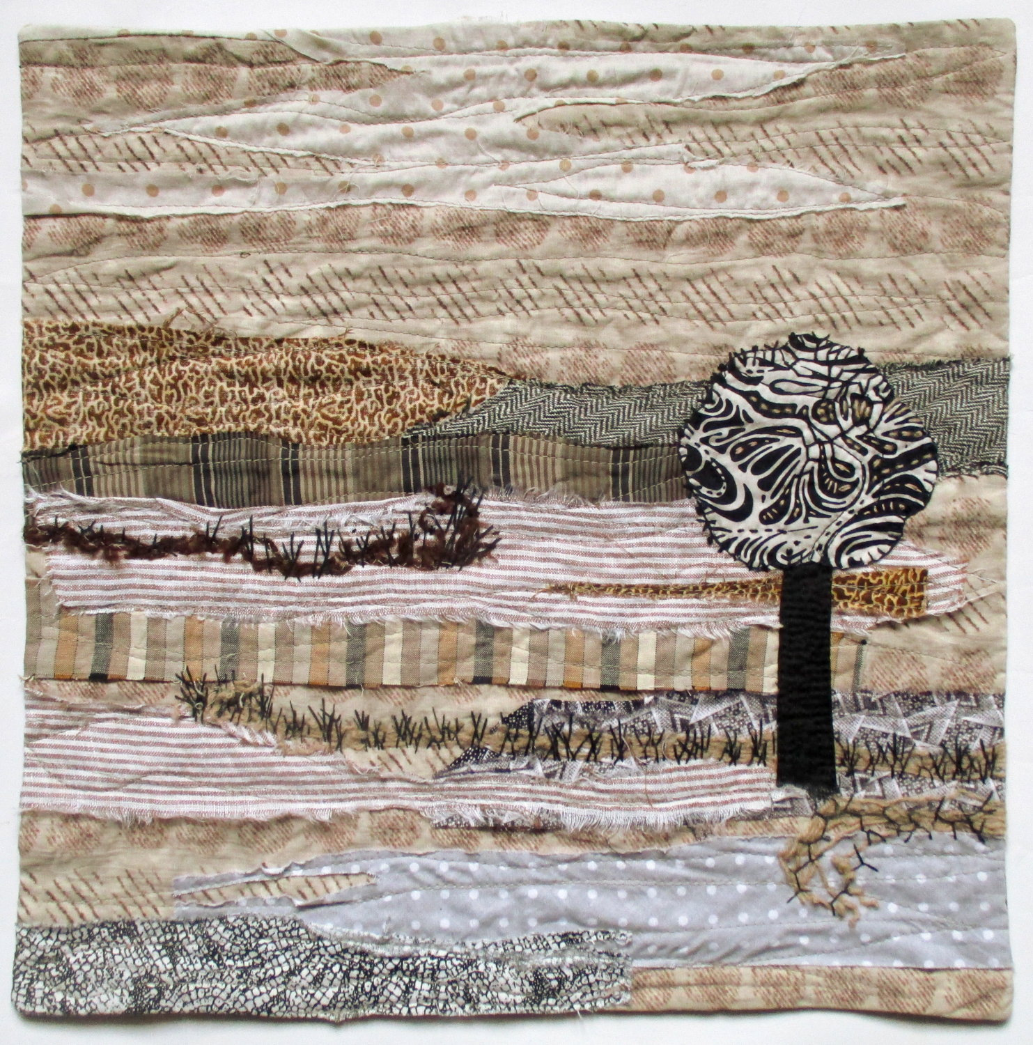 Great selection of fabrics and textures to create the background for this landscape. I like the way that the tree is placed off-centre to make the background as important as the tree. Lovely work