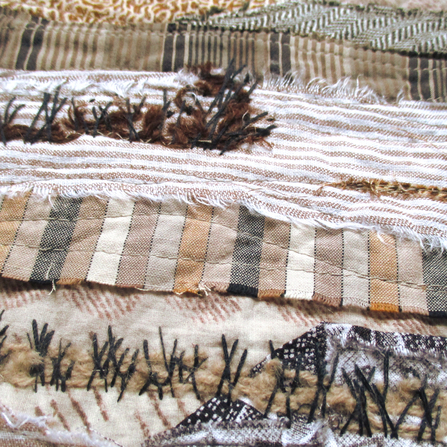 The use of frayed fabrics and your hand stitching adds interest to the subtle color palette. Well done.
