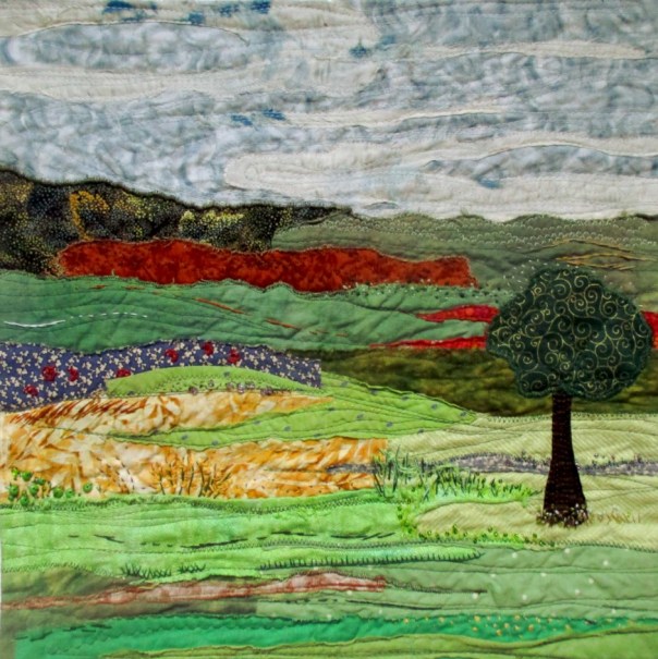 A beautiful and peaceful landscape. An inspiration for me as this will be my next subject! Lovely colors and fabrics, the lone tree makes for depth and I love the addition of hand stitching. Well done.