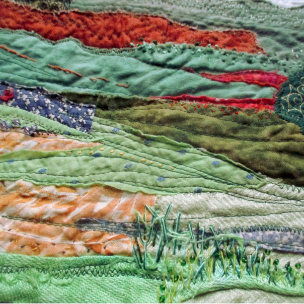 I love the way you have used collage to create the background and these are interesting fabrics. Your stitching gives another lovely level of detail, I’m looking forward to the future studies in your landscape