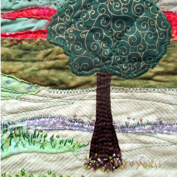 Love the textures and colors of the different fabrics. The hand stitching and beading add depth to this beautiful and welcoming landscape. Well done!