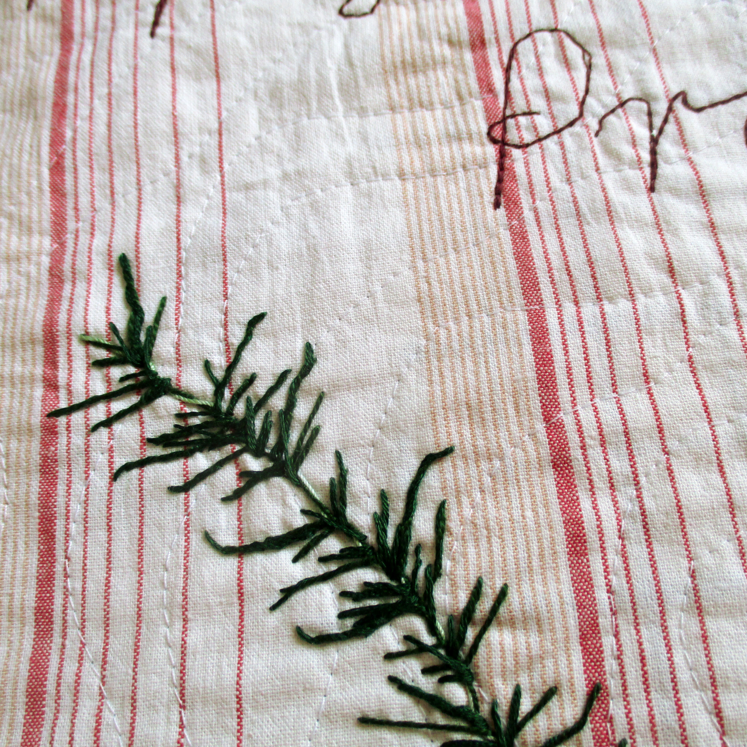 I can smell that rosemary too! Beautiful lifelike hand embroidery! This piece fits right into your series, with the folded napkin, the text and that bit of humor. Well done!