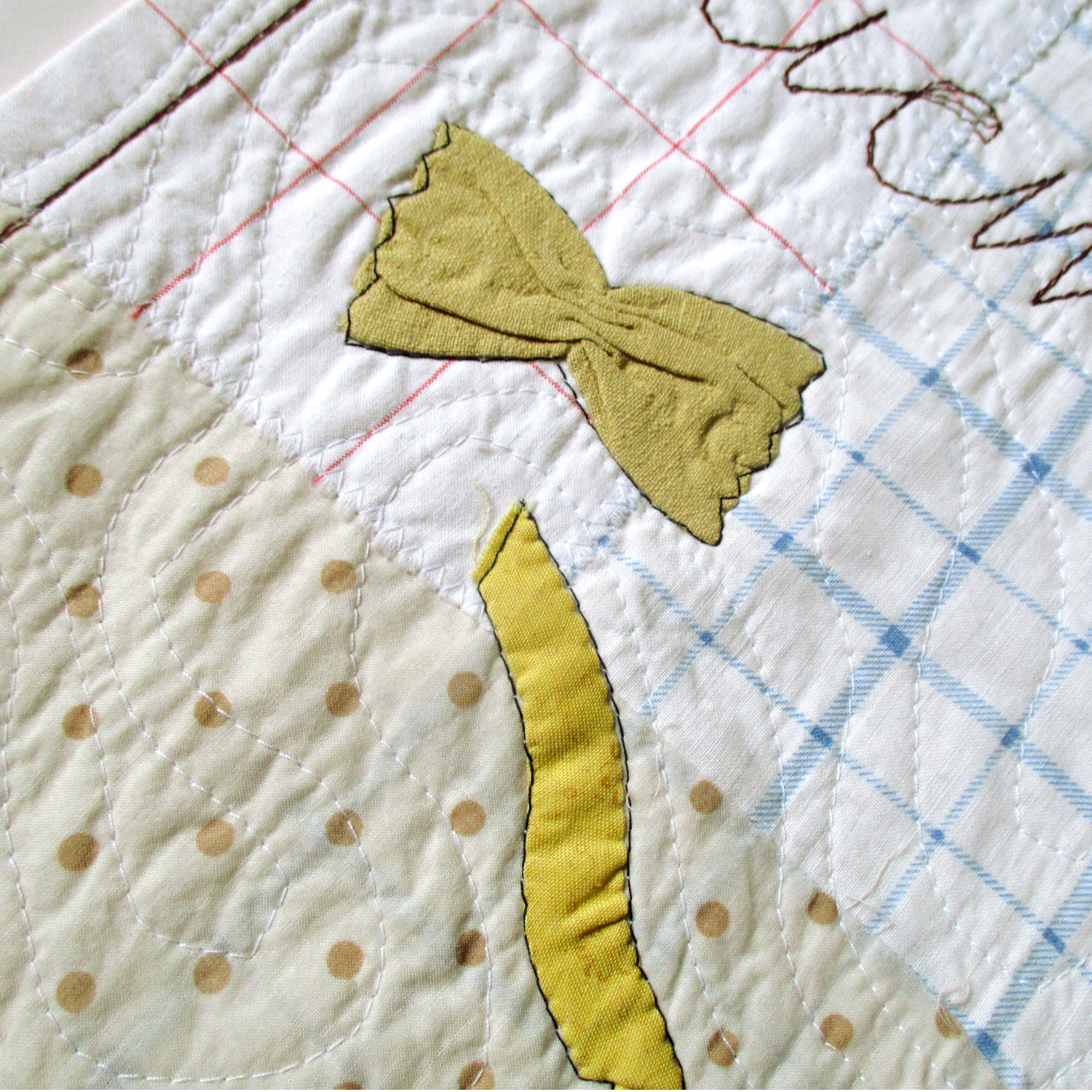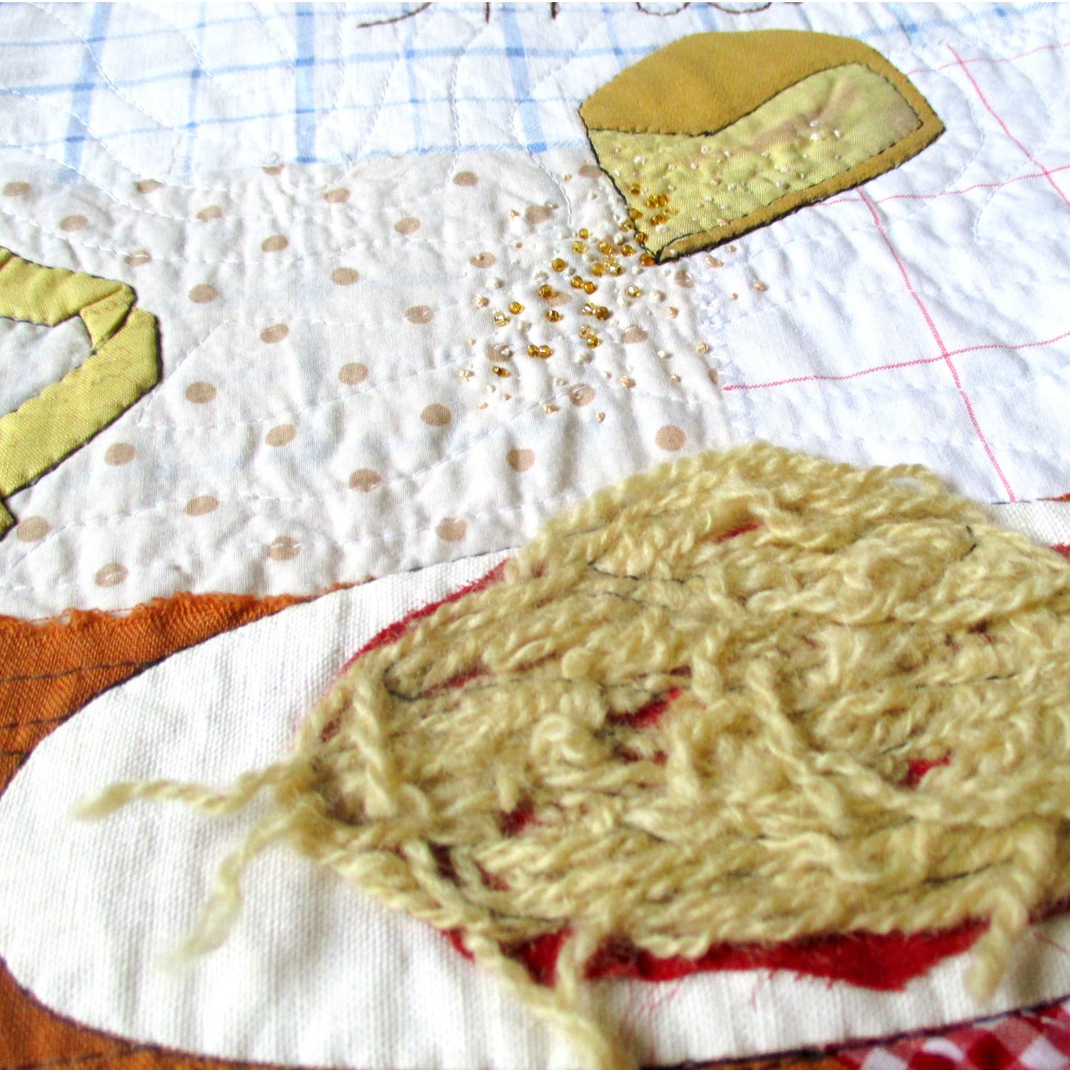 Your quilt is so inviting to sit down and start eating. The spaghetti looks so delicious! I love your fabric choices and the texture you created. Very well done, brvo!