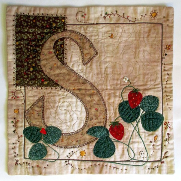 Waht a great idea for the letter series. I also love Medieval manuscripts and artwork and you have represented this beautifully. I like the care you have taken in your choice of fabric and colouring to hint at old paper, and the additionl of the strawberry gives it a lovely focal point. Well done.