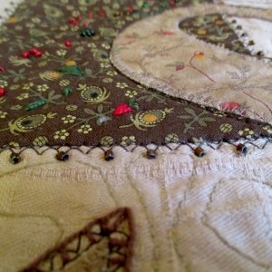 Technically I use here all of my favorite techniques – applique, beading, embroidery, hand and machine quilting. I also dyed the background fabric for the “old papirus” effect and painted some extra gold spots just like the medieval monks did.