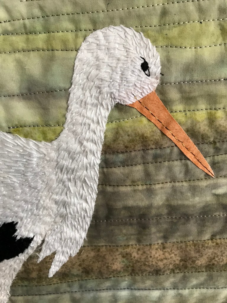 The storks are so lifelike. The stitching for feathers gives wonderful texture and the fabric choice for the background is ideal.