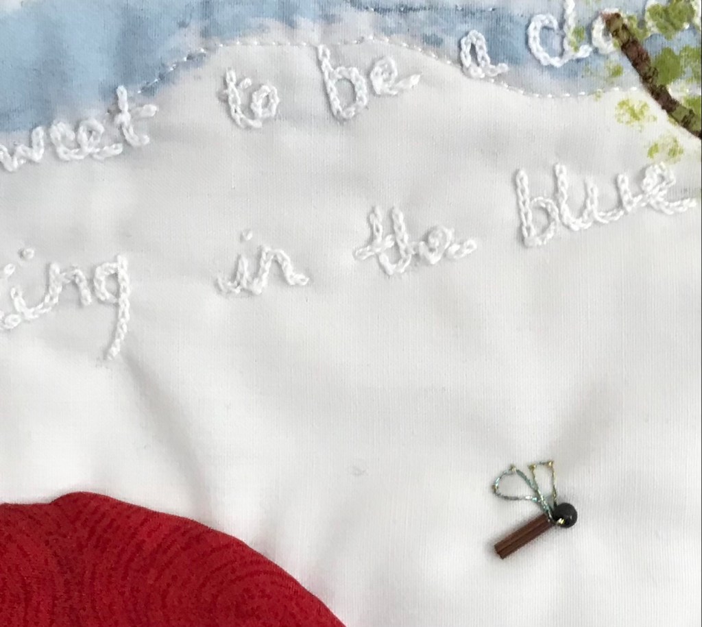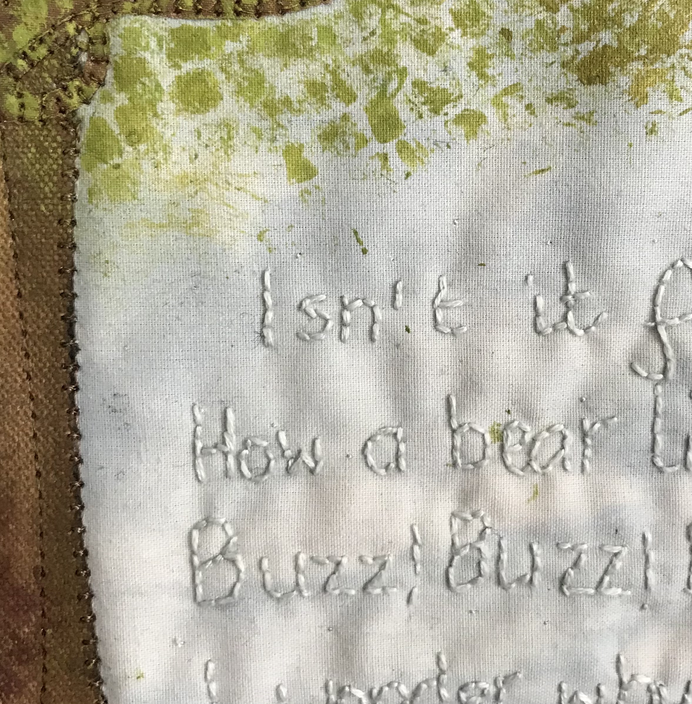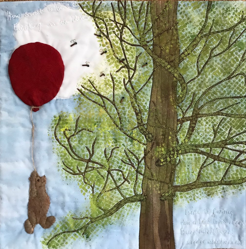 I used cotton which I painted as the sky, then I stencilled some ‘leaves’ before appliquéing the tree, the trunk is an old sheet and the branches a finer cotton. Once machine stitched I added another layer of ‘leaves’. The blue sky is lightly hand stitched, my bear is dyed wadding , the ballon a scrap of sari silk and I used a basic string. The rather odd bees are beads. There are two quotes from the book, the first chain stitched in the sky, “How sweet to be a cloud, Floating in the Blue” and the second chain stitched in the bottom left corner, “Isn’t it funny, How a bear likes honey? Buzz, Buzz, Buzz, I wonder why he does?”.