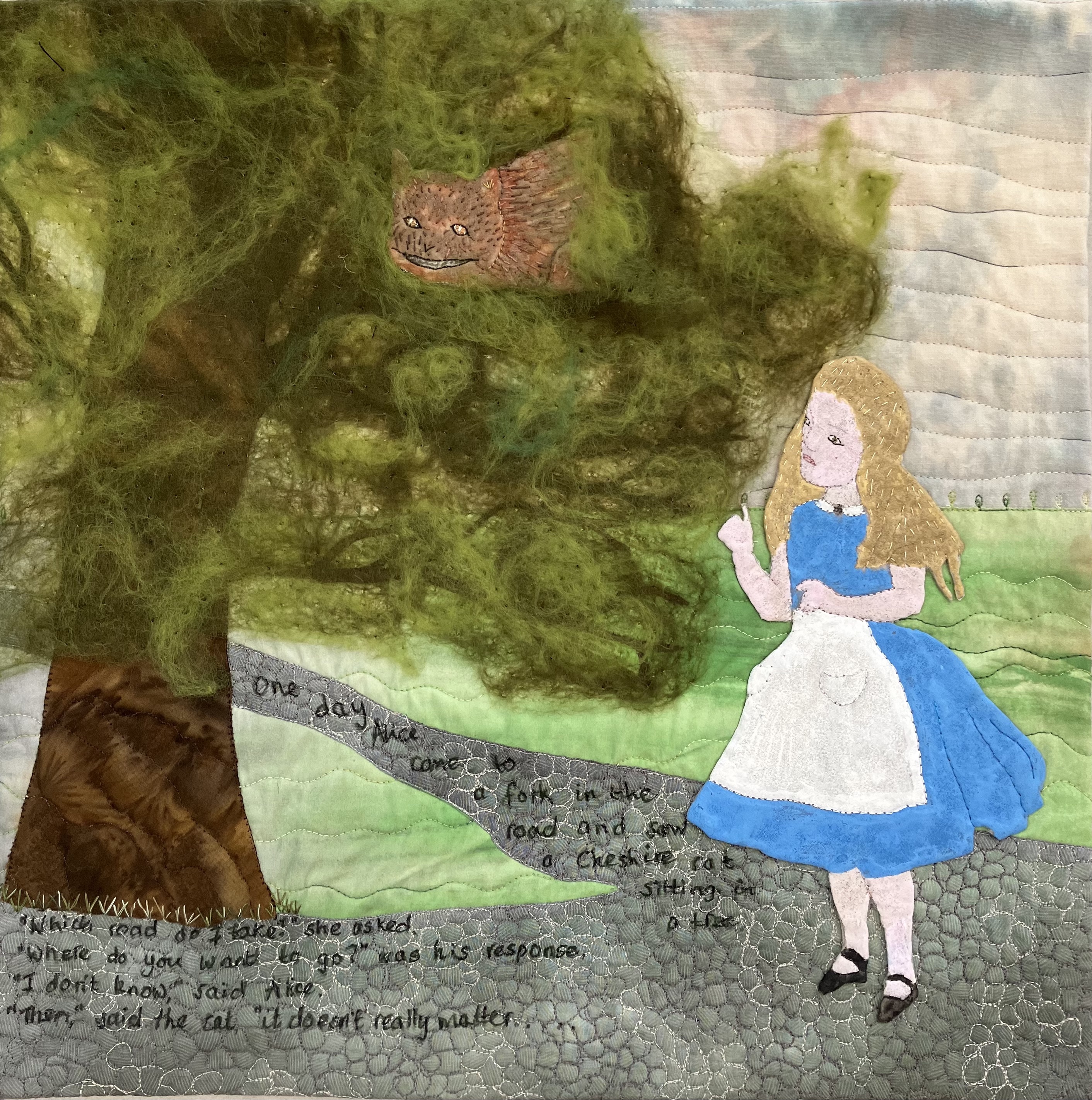 7. You’ve captured the essence of Alice’s fork in the road encounter. Your interpretation of the scene is spot on. Love all the techniques you used to create the tree and appliqués, very effective. Made me smile, well done.