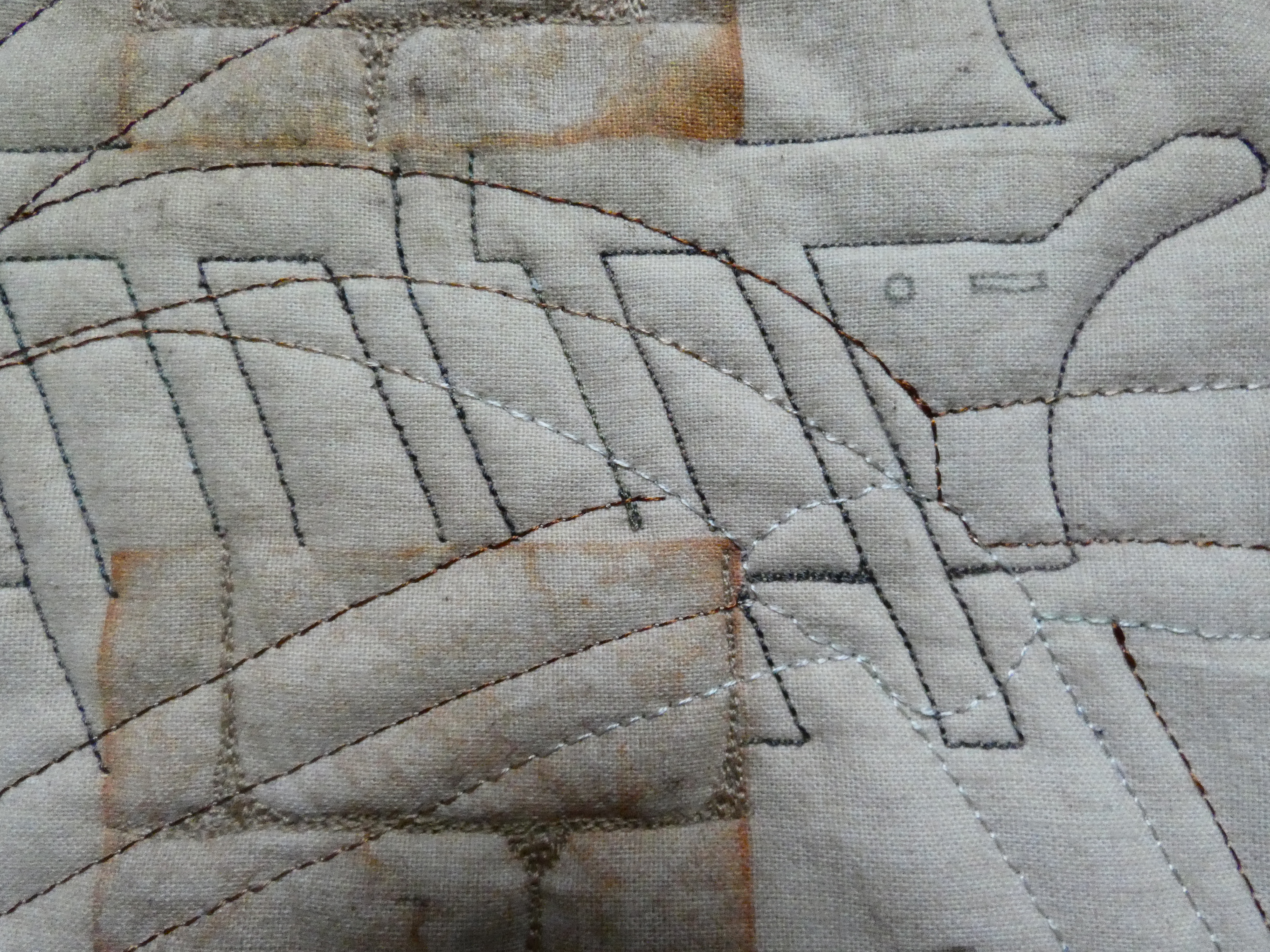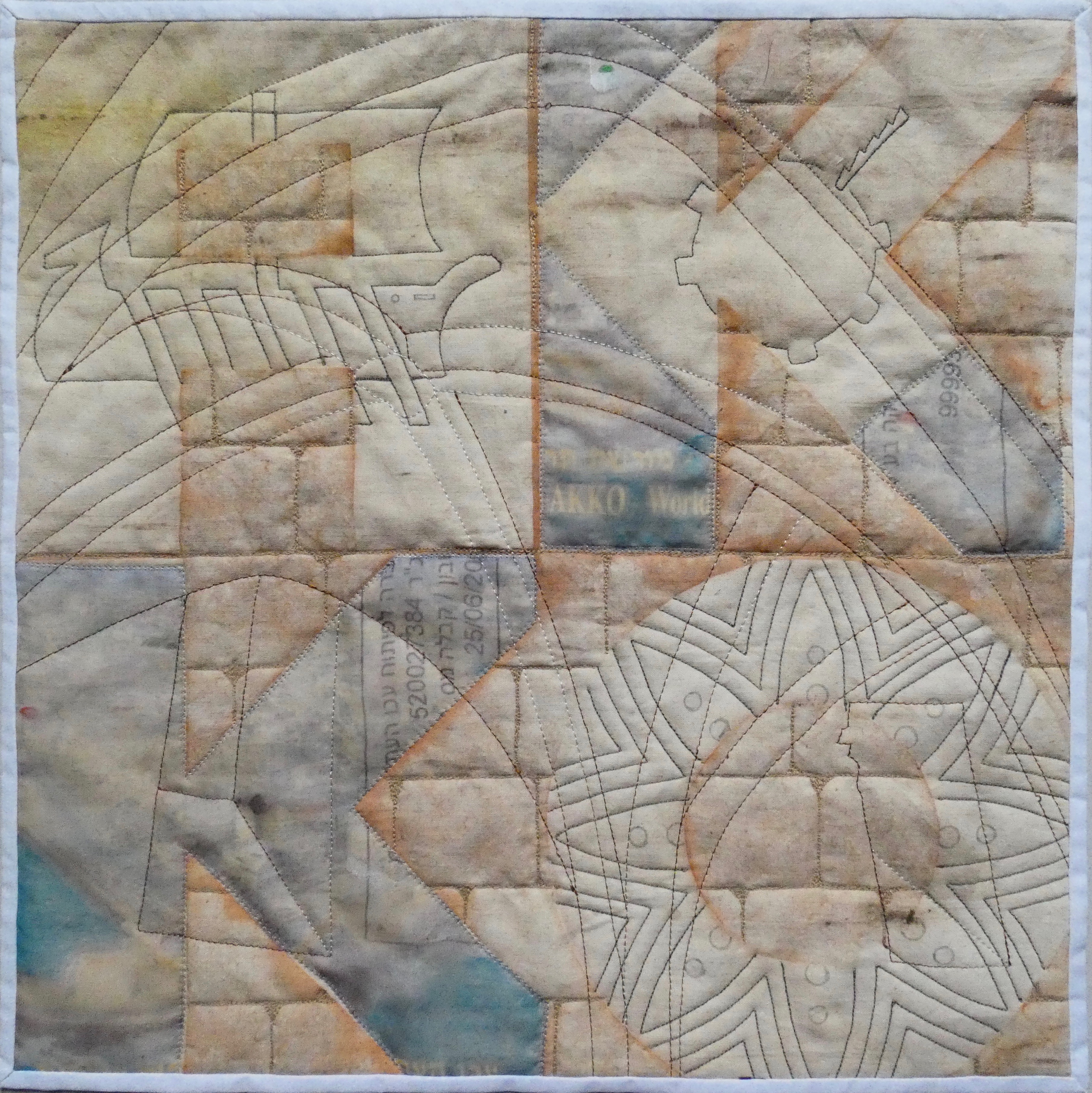 The colour of the old stones and the sunshine is what really rests in my memory from a really interesting, and hot, day out. I wanted to produce a snap shot of memories, icons that try to represent a very small part of the Akko’s ancient history. The background was painted and the letters printed with a sun print, then the space around the letters was stitched like an old stone wall. The letters were then embellished with different images. The faded colour is a ticket which I enlarged and printed on ExtravOrganza, one or two of the buildings and the sea were highlighted with inktense; there are three motifs which were stitched, two which come from the municipal flag representing the ancient port and more modern industry and the third is a the pattern of an old stone bread stamp seen in the museum. The whole piece was then stitched with the pattern of the vaults in the Knight’s Halls. The morse code letter is on the ship.