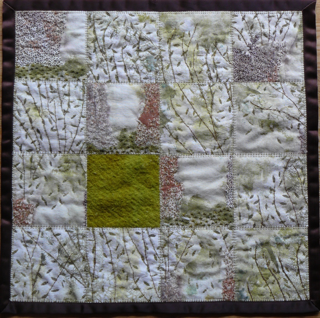 The original motif was created through two different resists, the dextrin one was a bit of a disaster but I used procion dye and achieved a basis on which to build with flour paste and fabric paint on a basic cotton fabric, the results were not too defined but it gave me a base to work on. The most nerve wracking was to cut up the design which I then machine stitched on to a dyed wadding. The hand stitching was then added square by square. I bordered the whole with a satin ribbon to create the frame of the “puzzle”. I decided to work each square after cutting to avoid cutting any stitching and with the raw edges having unravelled threads, it may have taken longer but I am happy with the way it worked.