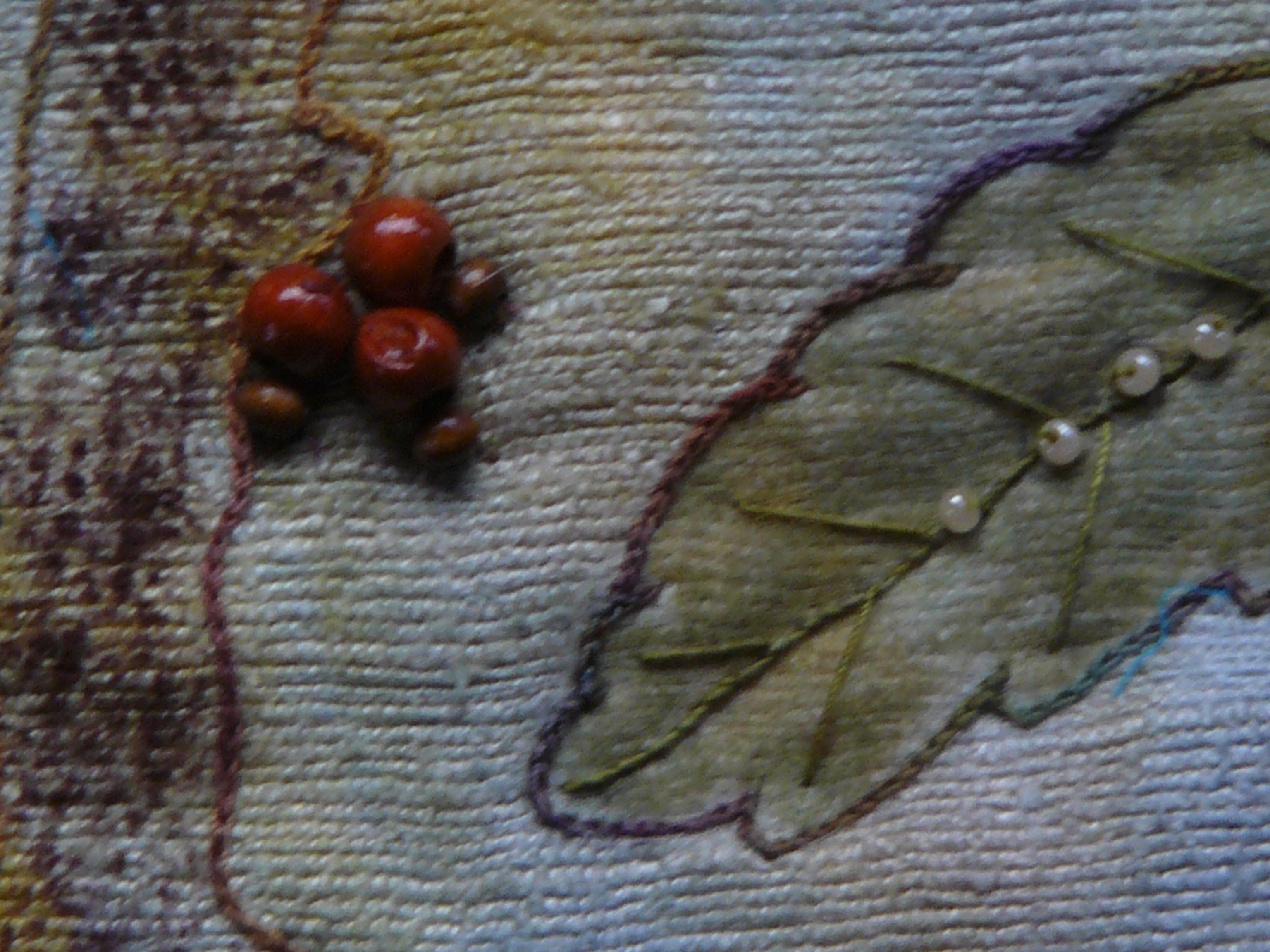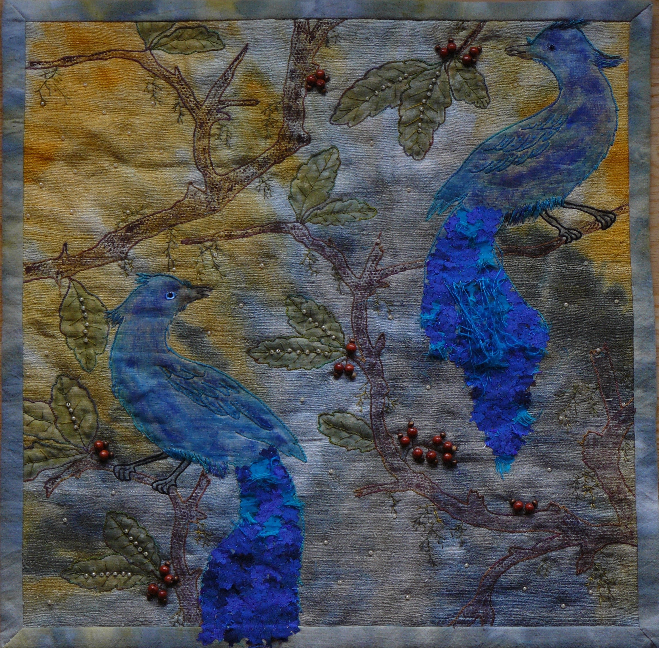 The course silk fabric is snow dyed with Procion dyes, the design was transfer via organza which was then for the most part cut away after I had chain stitched the outlines. I add the colour to the leaves and birds with a mix of paint sticks and Neocolours, the branches are painted through a fine net and the birds plumage consists of small pieces of silk which are Bondawebbed and then stitched. Beads were added for the berries and the small beads to represent the drops of water nestling on the leaves and dripping in the forest.