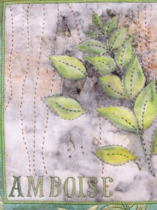 During this summer I did some ecoprinting tests and decided to use one of them in my composition. This small branch is coming from my garden, but the print being too pale I decided to enhance it with inktense blocks. I chose my background  from my hand dyed fabrics matching the colour with the inktense painting and appliqued my ecoprinted pannel in the middle.